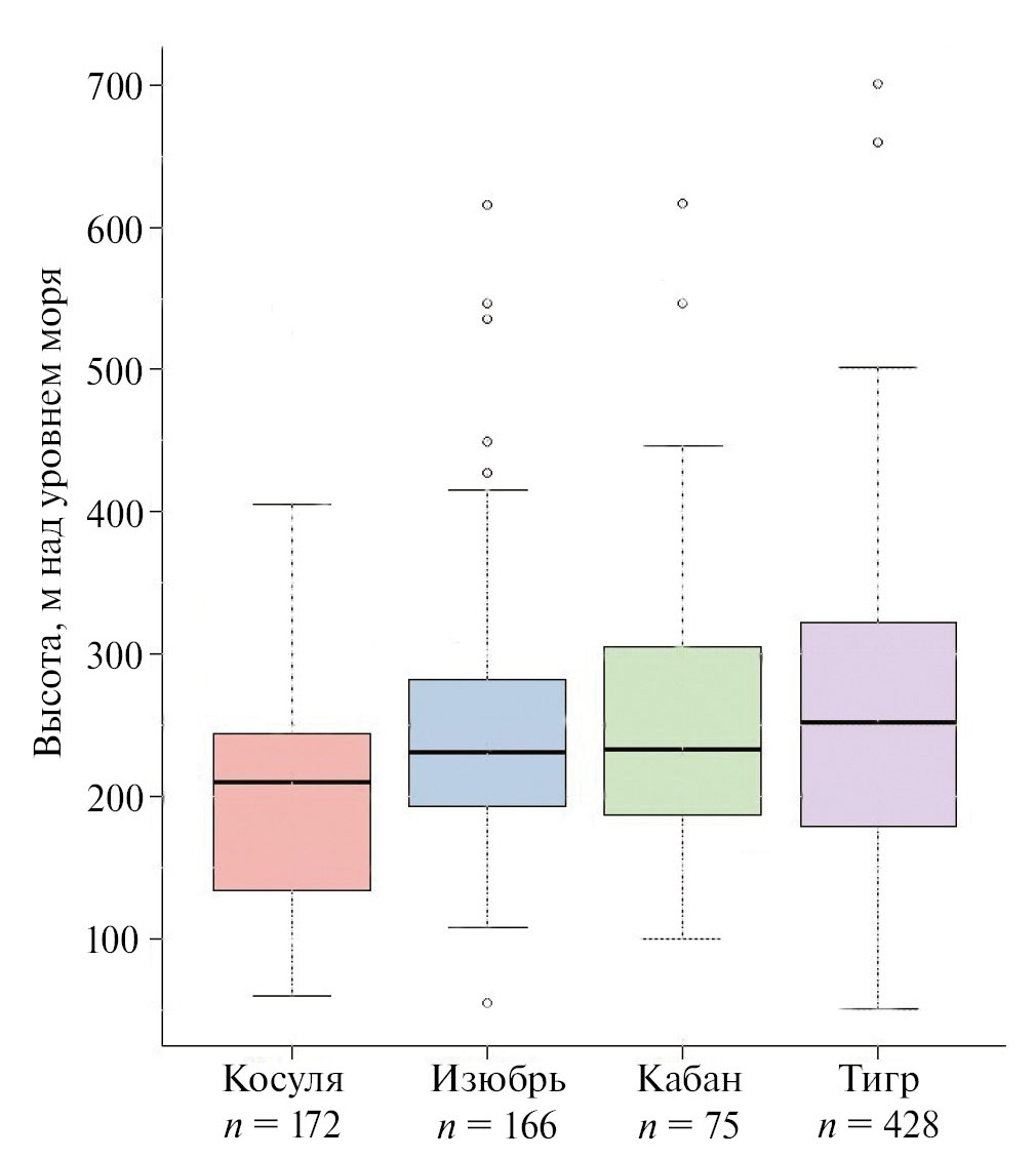 Рис. 4. Распределение следов косули, изюбря, кабана и тигра по высоте местности в зимний период. Указаны интерквартильные диапазоны (верхняя и нижняя границы прямоугольника), максимальные и минимальные значения, выбросы. Жирной линией в каждом прямоугольнике представлены медианные значения.