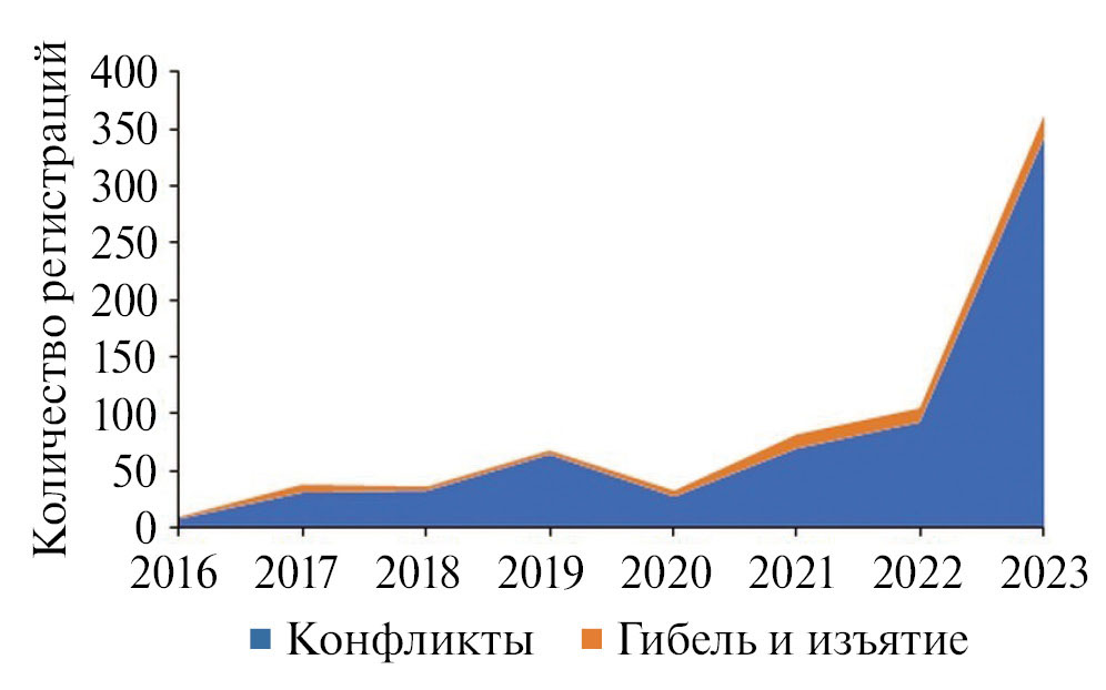 Всего проанализировано 484 сообщения о конфликтных ситуациях в 2021–2023 гг. в Хабаровском крае. Зимой 2021/2022 гг. здесь зарегистрирована гибель не менее шести выводков тигра, зимой 2022/2023 гг. – гибель четырех выводков, в то время как в сезон 2018/2019 гг. гибель тигрят в Хабаровском крае не регистрировалась.