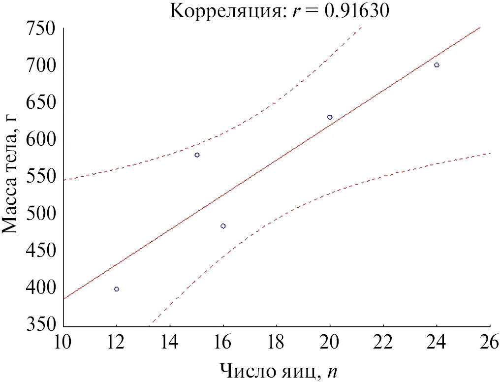 Проведенный корреляционный анализ отношения длины тела беременных самок к числу откладываемых ими яиц, а также отношения массы их тела к числу отложенных яиц выявил положительную (значимую, r ₌ 0.9) корреляцию между массой тела самок и числом отложенных ими яиц (рис. 2).