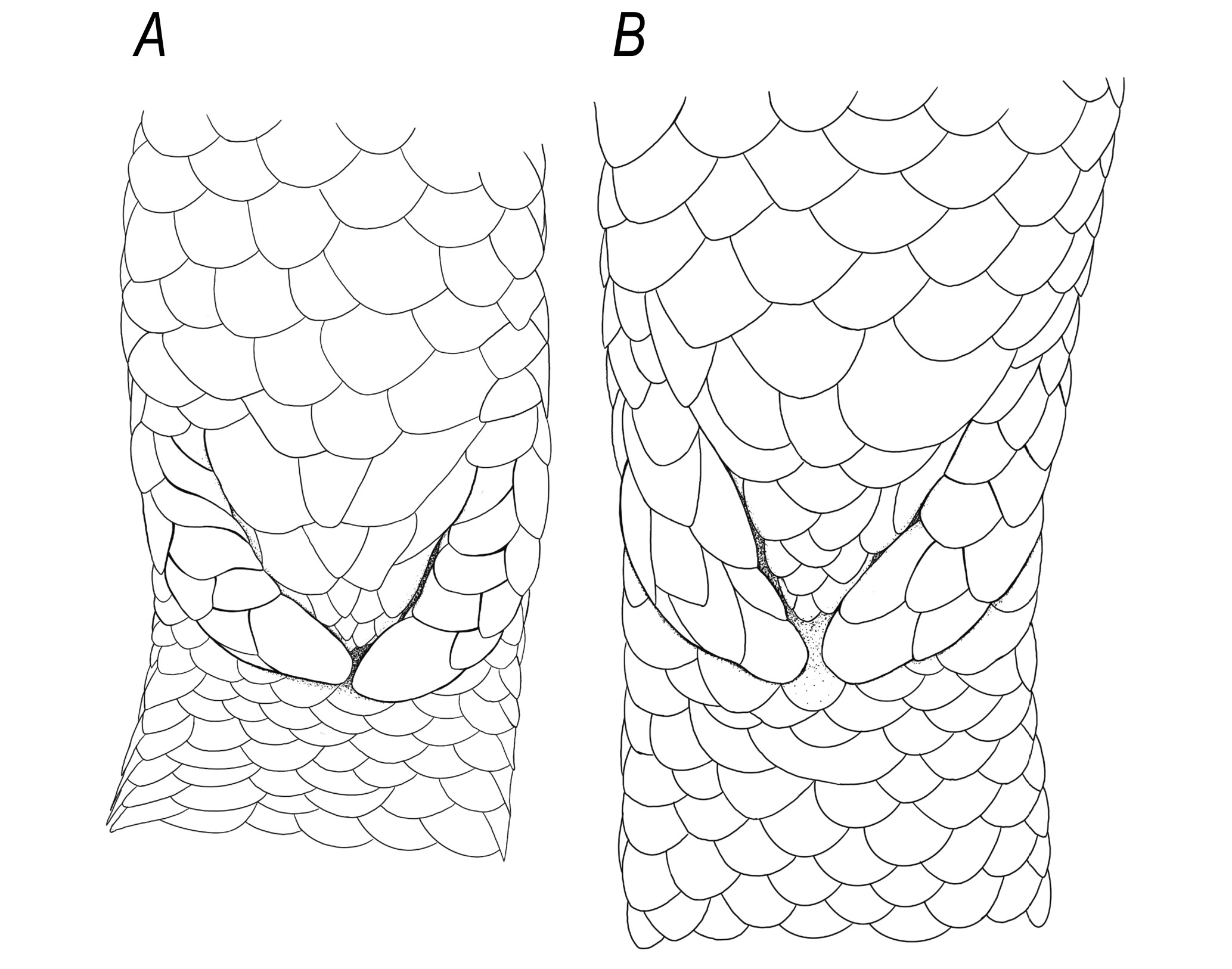 Рис. 5. Схема фолидоза клоакальной области и конечностей Dibamus elephantinus sp. n. (А – голотип ZMMU Re-17894, самец) и D. dalaiensis (В – голотип LSUHC09777, самец, по: Neang et al., 2011). Рисунки выполнены Клюкиным Н. С.