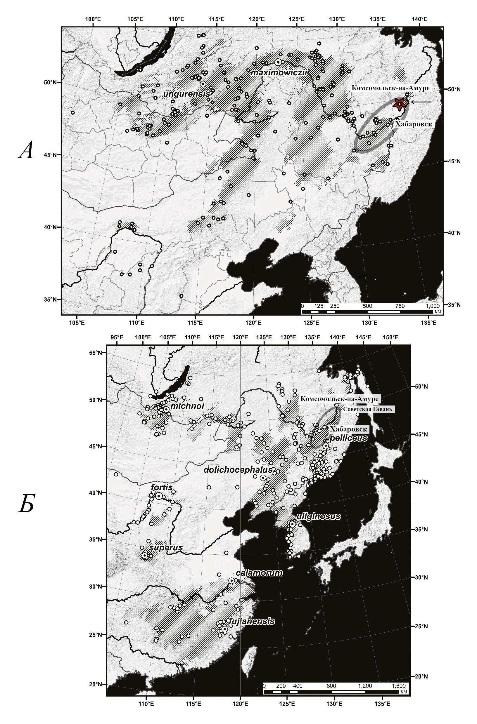 Долгое время без подтвержденных данных считали, что в Хабаровском крае, в окрестностях г. Советская Гавань и близлежащих поселках обитает A. maximowiczii (Костенко, 2000). По данным других источников, здесь (рис. 1Б) обитает A. fortis (Shenbrot, Krasnov, 2005; Kryštufek, Shenbrot, 2022), на основании чего в первой работе распространение вида было указано на всей территории Сихотэ-Алиня, во второй – вдоль восточных склонов горного хребта морского побережья Японского моря до г. Советская Гавань. Однако кариотипирование полевок из г. Советская Гавань и окрестных поселков (Картавцева и др., 2011) позволило выявить инвазивный вид – восточноевропейскую полевку (Microtus rossiameridionalis Ognev 1924). Молекулярно-генетический анализ (Шереметьева и др., 2021) подтвердил нахождение здесь восточноевропейской полевки, а также неоднократный ее завоз и в г. Хабаровск. Все три вида, обнаруженных в Хабаровске, являются носителями видоспецифичных штаммов различных вирусных и бактериальных инфекций, опасных для человека (Лапин и др., 2015), поэтому знание об их распространении представляет интерес не только для зоологов, но и для эпидемиологов.