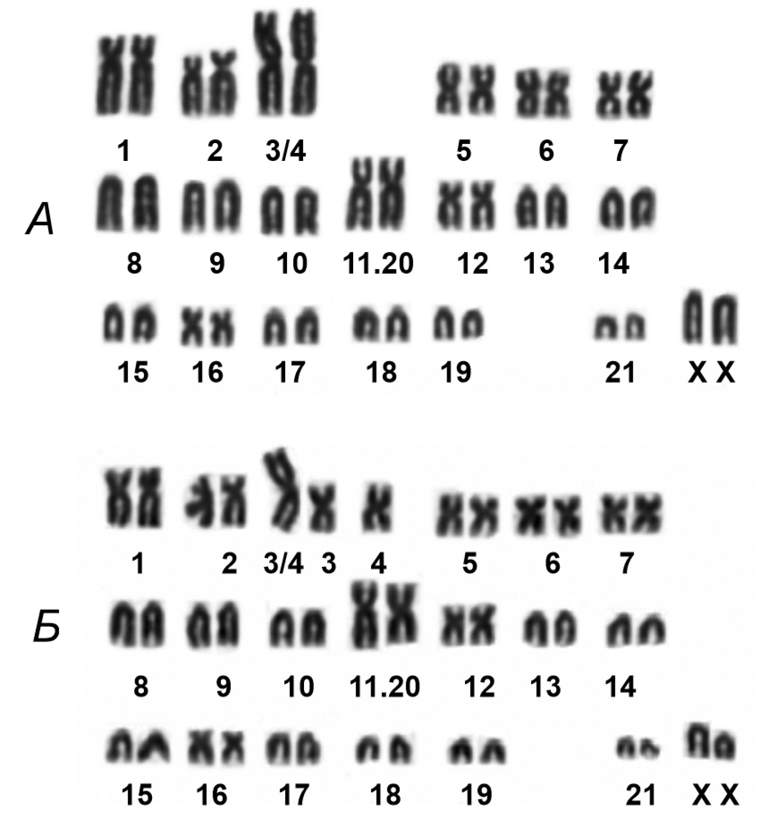 Рис. 2. Хромосомы полевки Максимовича Alexandromys maximowiczii из окрестностей поселка Эльбан Хабаровского края: А – самка № 4854 из точки 2 (вариант 2n = 40а, NF = 58), Б – самец № 4838 из точки 1 (вариант 2n = 41а, NF = 60). Дробь в числе 3/4 указывает на тандемное слияние хромосом, точка в числе 11.20 – на акроцентрическое слияние. В кариотипе пары № 12 и № 16 – субметацентрические хромосомы. Номера пар хромосом соответствуют таковым для полевок Забайкальского края, приведенным в публикации Lemskaya с соавторами (2010).