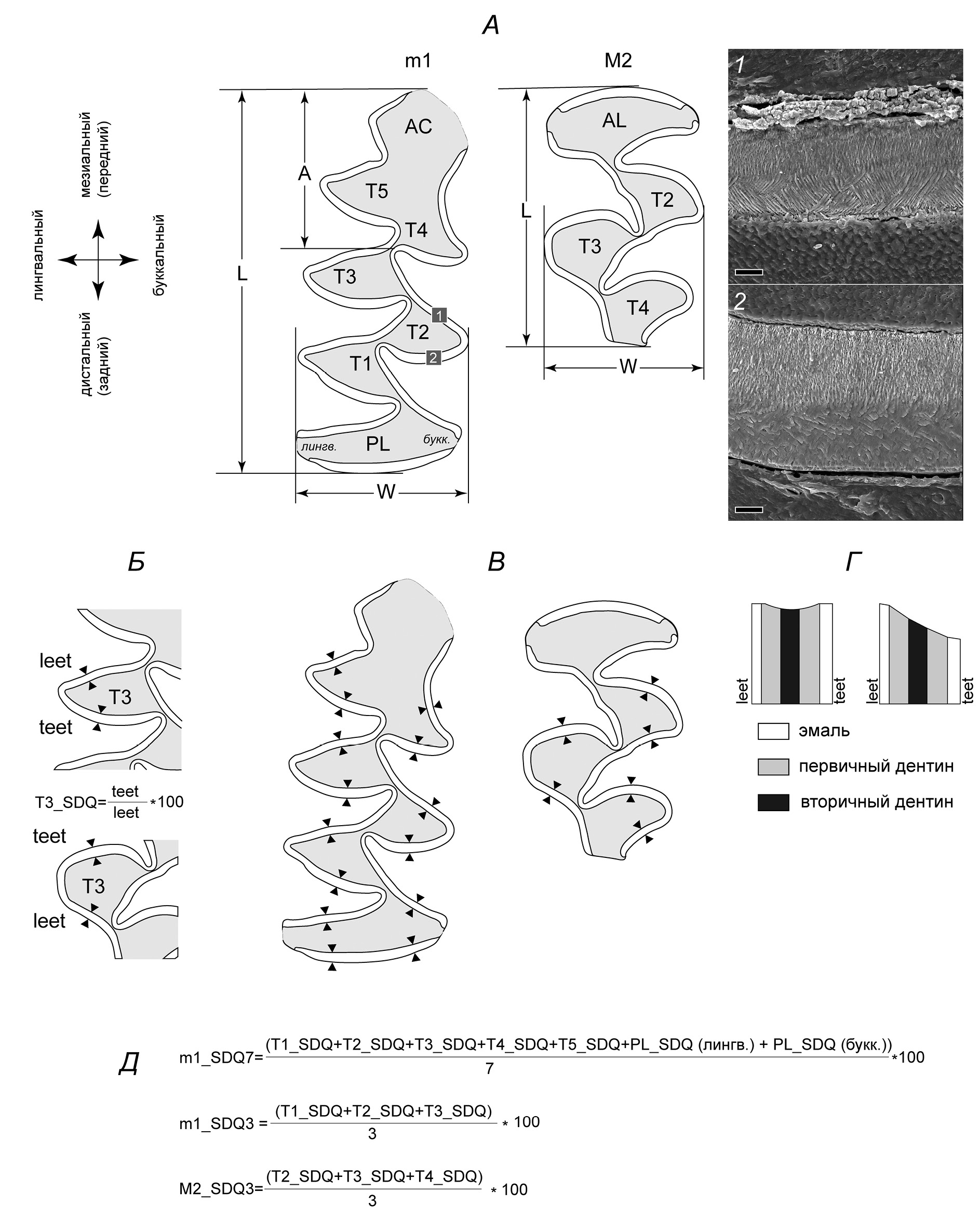 Рис. 1. Номенклатура элементов первого нижнего и второго верхнего щечных зубов и схема оценки дентальных признаков. А – Обозначения призм зубов (по: Van der Meulen, 1973), метрические признаки жевательной поверхности и участки 1–2, где толщину эмали оценивали дополнительно с учетом ее микроструктуры с помощью электронного сканирующего микроскопа; 1 – передняя стенка, 2 – задняя стенка, масштаб 20 мкм. Б – Схема измерения индекса дифференциации эмали SDQ на одной призме (на примере Т3), В – Места измерения толщины эмали для расчета индексов m1_SDQ7, m1_SDQ3, M2_SDQ3. Г – Типы стачивания жевательной поверхности на примере одной призмы зуба: слева – лунчатый тип, справа – ступенчатый тип. Д – формулы индексов дифференциации эмали на первом нижнем и втором верхнем щечных зубах. Сокращения – см. в тексте.