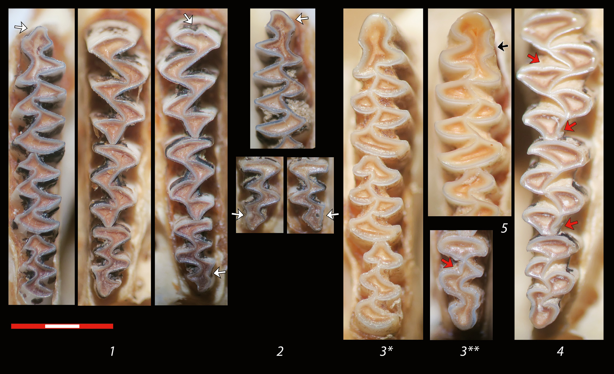 Рис. 4. Жевательная поверхность щечных зубов водяной полевки со зрелостью черепа 20% (1,2) и 100–100+% (3–5). Белые стрелки – не достигшие дефинитивных очертаний отделы m1, M1 и М3 ювенильных особей, красные стрелки – сенильная складчатость эмалевых граней, черная стрелка – “мимомисная складка”, обнаруженная единично и являющаяся проявлением индивидуальной изменчивости. 1, 2 – id 95 и id 96, Нахичевань, 20% зрелость черепа, пол и дата отлова неизвестны; 3 – id 44/3, самка, Гёйгёльский р-н, 100+% зрелость черепа, 23 июня 1964 г. (* нижний зубной ряд, ** М3), 4 – id 2854 (899), Чухур-Юрт, Шемахинский р-н, пол неизвестен, 11 октября 1926 г., 100% зрелость черепа, 5 – id 7, оз. Сары-Су, Саатлинский р-н, 18 марта 1965 г., самка, череп 100+%.