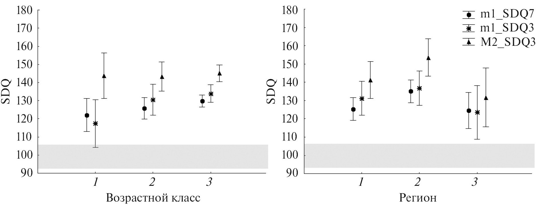 Рис. 6. Средние значения и 95% доверительный интервал значений трех индексов дифференциации эмали щечных зубов водяной полевки из Азербайджана по возрастным классам (слева) и по регионам отлова для животных возрастного класса 3 (справа). Серым цветом показана область перекрывания размаха абсолютных значений индексов SDQ евразийской и персидской водяных полевок, установленная по литературным данным (Röttger, 1987; Fadeeva et al., 2021; Maul et al., 2021). Возрастные классы (по зрелости черепа, %): 1 – 20–45, 2 – 50–95, 3 – 100–100+; регионы: 1 – южный склон Большого Кавказа, 2 – Кура-Араксинская низменность, 3 – Малый Кавказ и Закавказское плато.