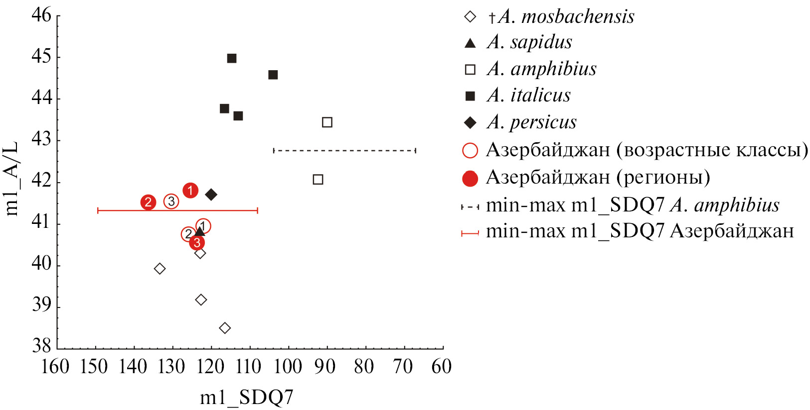 Рис. 7. Сравнение выборок современной водяной полевки из Азербайджана с литературными данными (Königswald, Kolfschoten, 1996; Masini et al., 2020; Fadeeva et al., 2021) по современным видам (включая A. sapidus, A. amphibius и спорный таксон A. italicus) и среднеплейстоценовой форме A. mosbachensis по значениям индексов m1_SDQ7 и m1_A/L. Точки – средние значения двух индексов, линии – размах изменчивости индекса m1_SDQ7. Возрастные классы – см. в тексте, данные по регионам – без учета возраста животных.