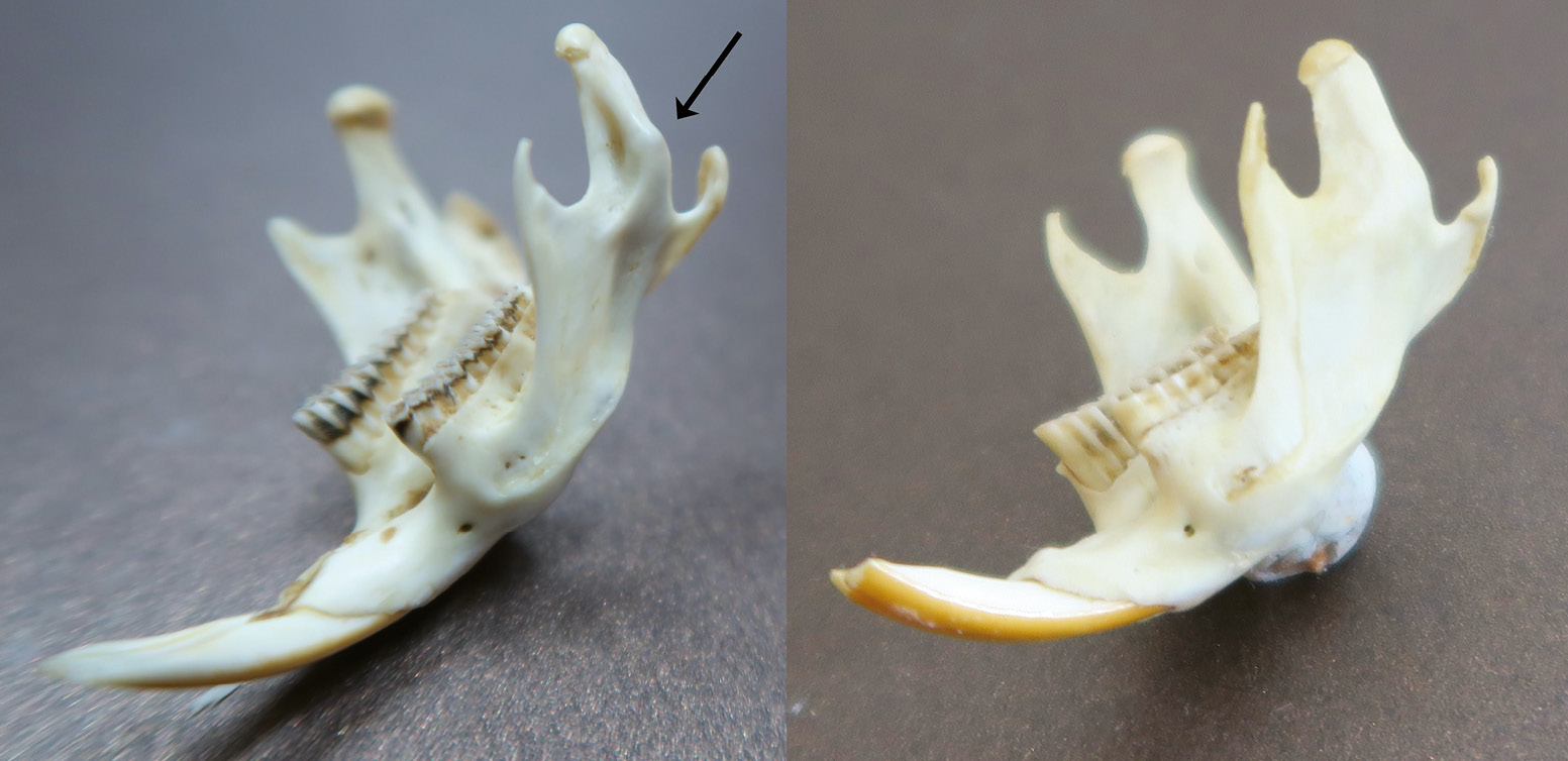Приложение 5. Варианты строения заднего отдела нижней челюсти водяной полевки из Азербайджана в возрастной группе 100+: id 44/3, самка, Гёйгёльский р-н, 100+% зрелость черепа, 23 июня 1964 г. (слева) и id 7, оз. Сары-Су, Саатлинский р-н, 18 марта 1965 г., самка, череп 100+% (справа)