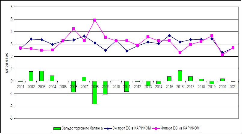 В период 2001—2021 гг. объем торговли между ЕС и карибскими странами оставался практически на одном уровне — чуть более 5,3 млрд евро. Отрицательное сальдо торгового баланса для ЕС в торговле в этот период неоднократно сменялось на положительное (см. график 5). В период мирового финансового кризиса 2008—2009 гг. торговое сальдо для Евросоюза было отрицательным: государства ЕС в основном импортировали из карибских стран продовольствие, снизив экспорт. По оценкам экспертов, торговле карибских государств с ЕС присущи элементы колониального торгового обмена. Экспортируются сырьевые товары, а импортируются промышленные изделия [37]. Особенностью отношений ЕС со странами Карибского бассейна является преимущество в торговле в пользу карибских государств, что позволяет им беспрепятственно экспортировать свои товары на единый европейский рынок.