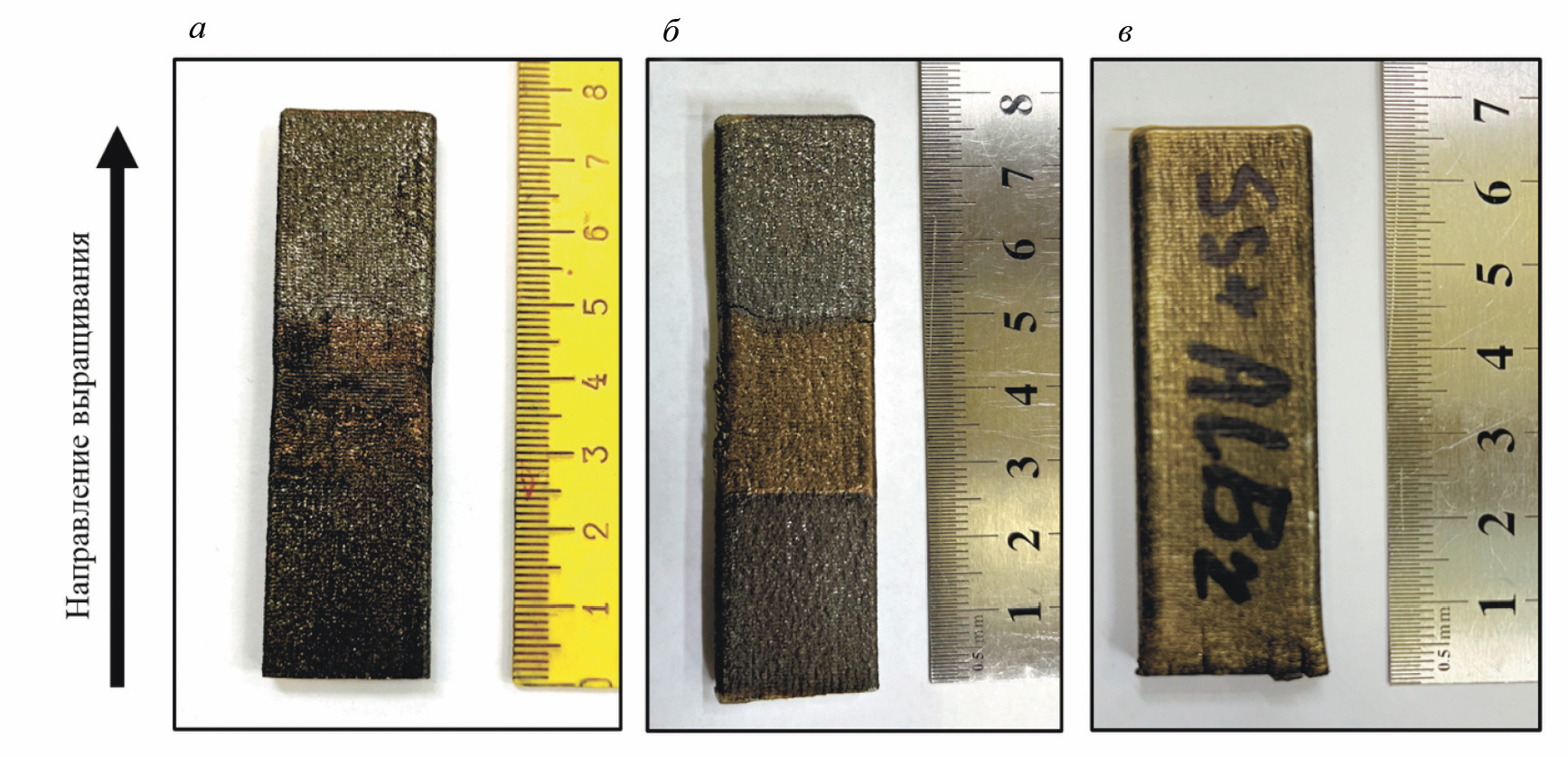 Рис. 4. Образцы из функционально-градиентных материалов, полученные методом прямого лазерного выращивания, стрелкой обозначено направление выращивания.