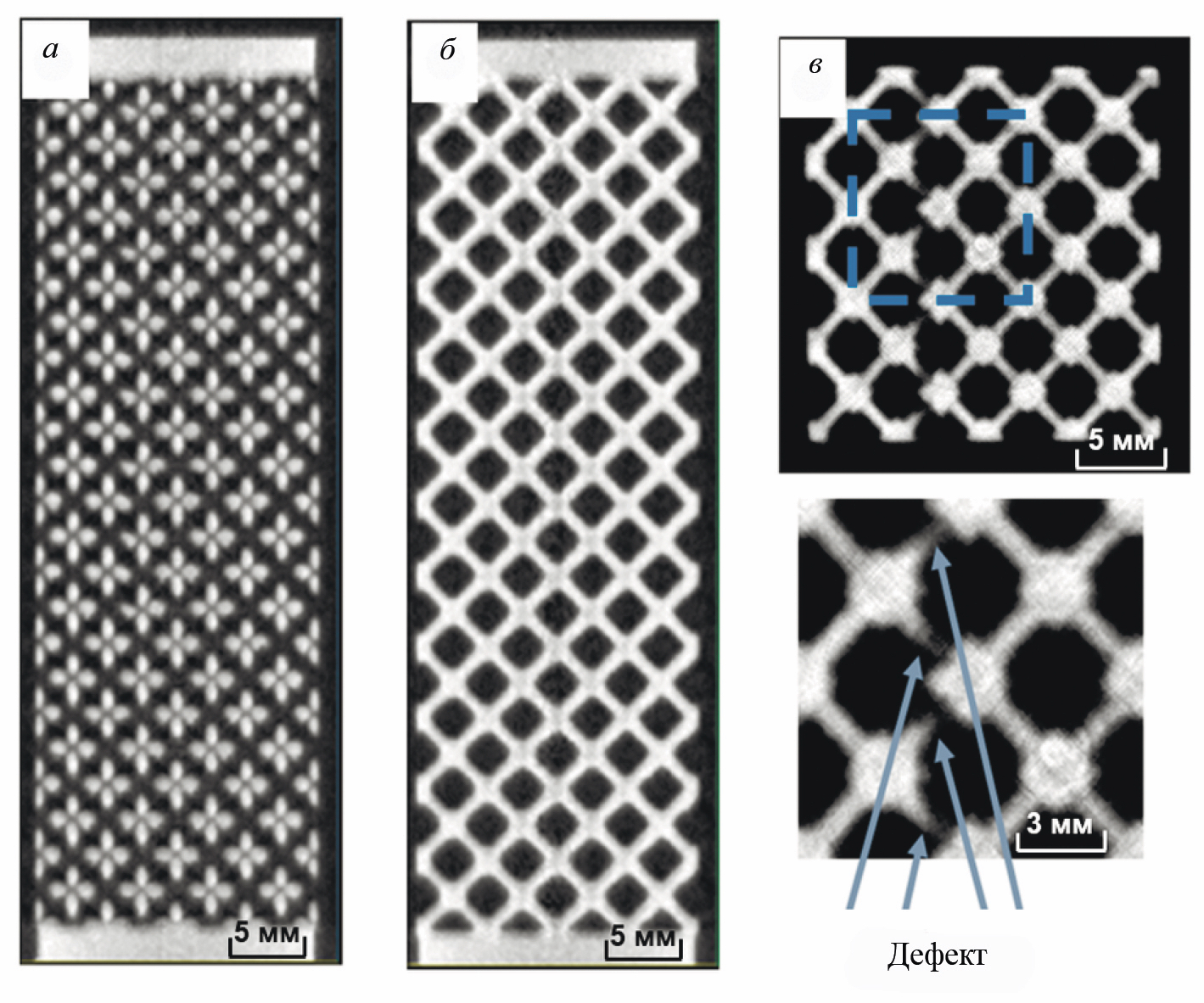 Рис. 5. Томографические изображения образца с сетчатой структурой из сплава марки CL20es в трех взаимно перпендикулярных проекциях (а—в). Дефекты печати отмечены стрелками.