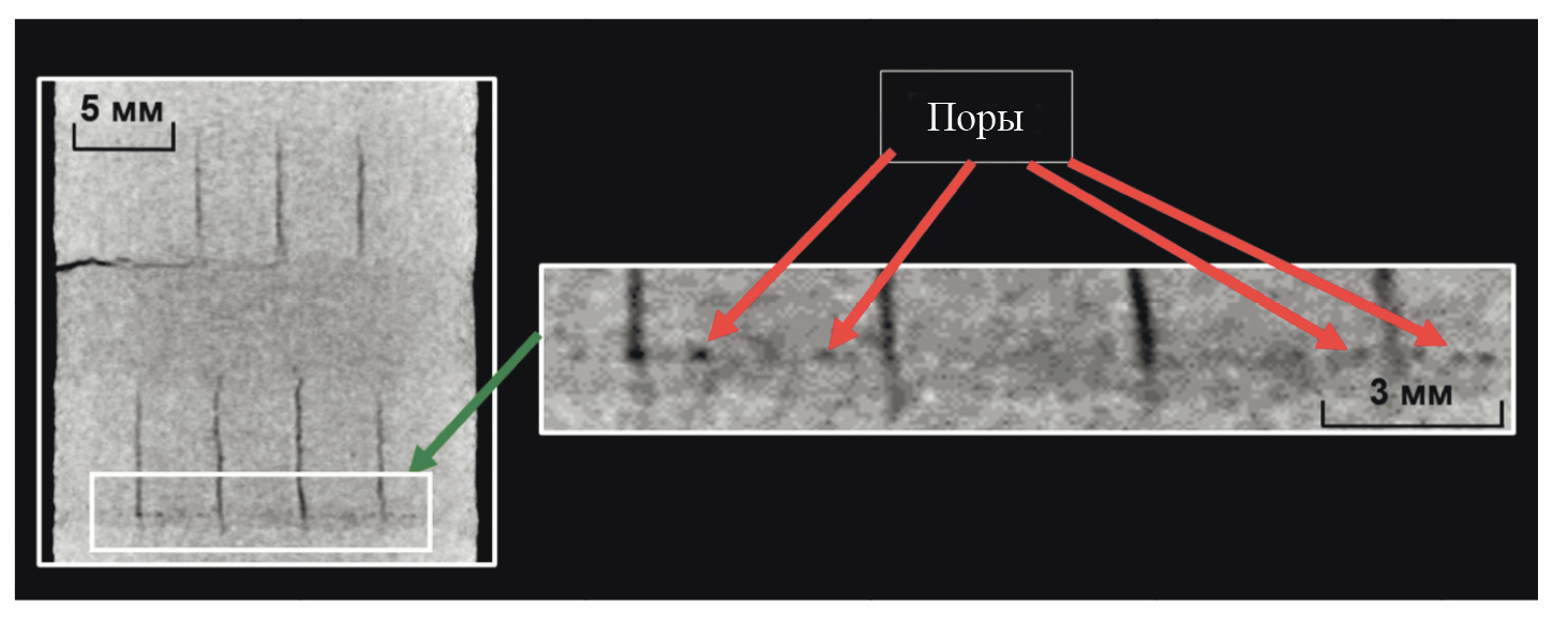 На полученных томографических изображениях образца А видно большое количество трещин (рис. 6), большая часть которых направлена вдоль направления выращивания. Такие продольные трещины располагаются в двух переходных областях (25 % алюминиевой бронзы и 75 % аустенитной стали), имеют выход на поверхность, большинство пересекают всю область вдоль направления выращивания. Размер трещин составляет ≈180 — 300 мкм, глубина — ≈2,5 — 3 мм при толщине образца 6 мм. На рис. 7 показаны поры, локализованные вблизи границы между областями аустенитной стали и смеси бронзы и аустенитной стали (25 и 75 %). Размер пор составляет от 180 до 350 мкм. Поры размерами менее 180 мкм не были визуализированы из-за ограничений в пространственном разрешении. Наличие трещин и пор говорит о неоптимальном выборе скоростного и температурного режимов изготовления образца либо о недостатке стратегии выращивания. Установление причин образования трещин вдоль направления выращивания требует дополнительных исследований. Можно предположить их связь с эпитаксиальным ростом зерна, обнаруженным в ходе проведенных ранее экспериментов.