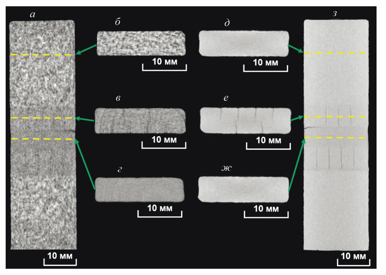 На рис. 10 показаны томографические изображения образца В. На изображениях видно чередование слоев разного состава. Внутренние дефекты не обнаружены (за исключением трещин, появившихся в процессе удаления образца с подложки). Геометрия слоев сохраняется на всем протяжении печати образца как снаружи, так и внутри.