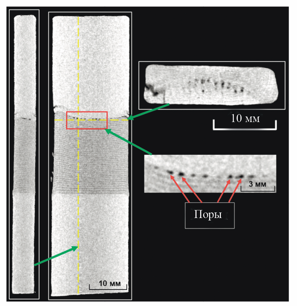 На томографических изображениях образца Б (рис. 9) четко виден контраст между слоями из алюминиевой бронзы и стали. При удалении от подложки в зоне чередования материала слои перестают накладываться параллельно. Последний слой в области чередования имеет разницу по высоте от края образца до его центра ≈ 2 мм. При этом геометрия слоев внутри и снаружи образца разная. Помимо этого, на границе области чередования слоев и области, состоящей из чистой аустенитной стали, как и в предыдущем образце, наблюдается наличие большого количества пор, которые достигают ≈ 1,2 мм вдоль слоев печати и ≈ 250 мкм — поперек. Поры расположены в глубине образца и не выходят наружу.