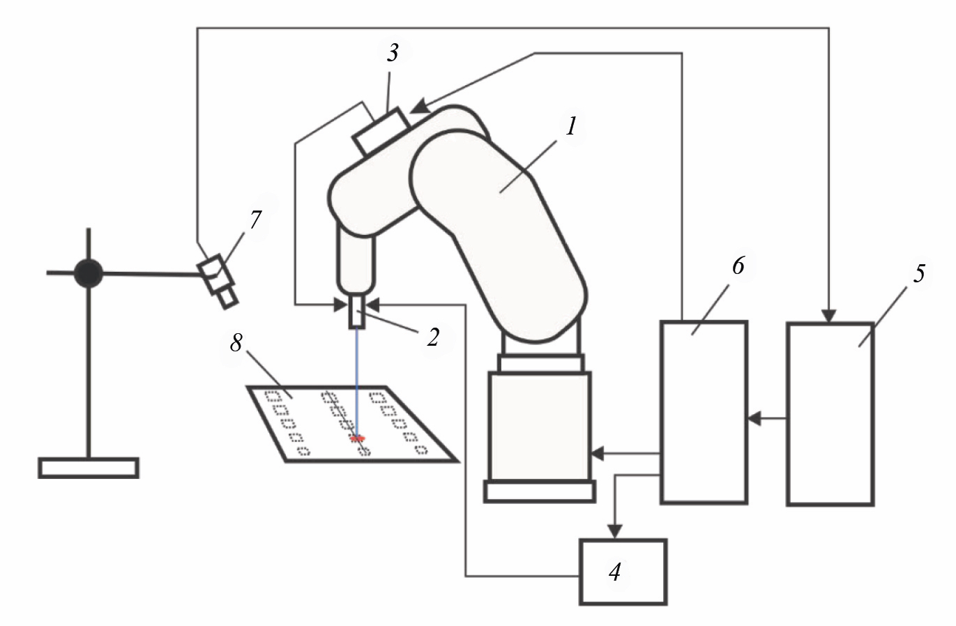 1 — манипулятор; 2 — лазер; 3 — блок контроллера с ШИМ выходом; 4 — блок питания; 5 — компьютер; 6 — контроллер манипулятора; 7 — тепловизор; 8 — объект контроля.