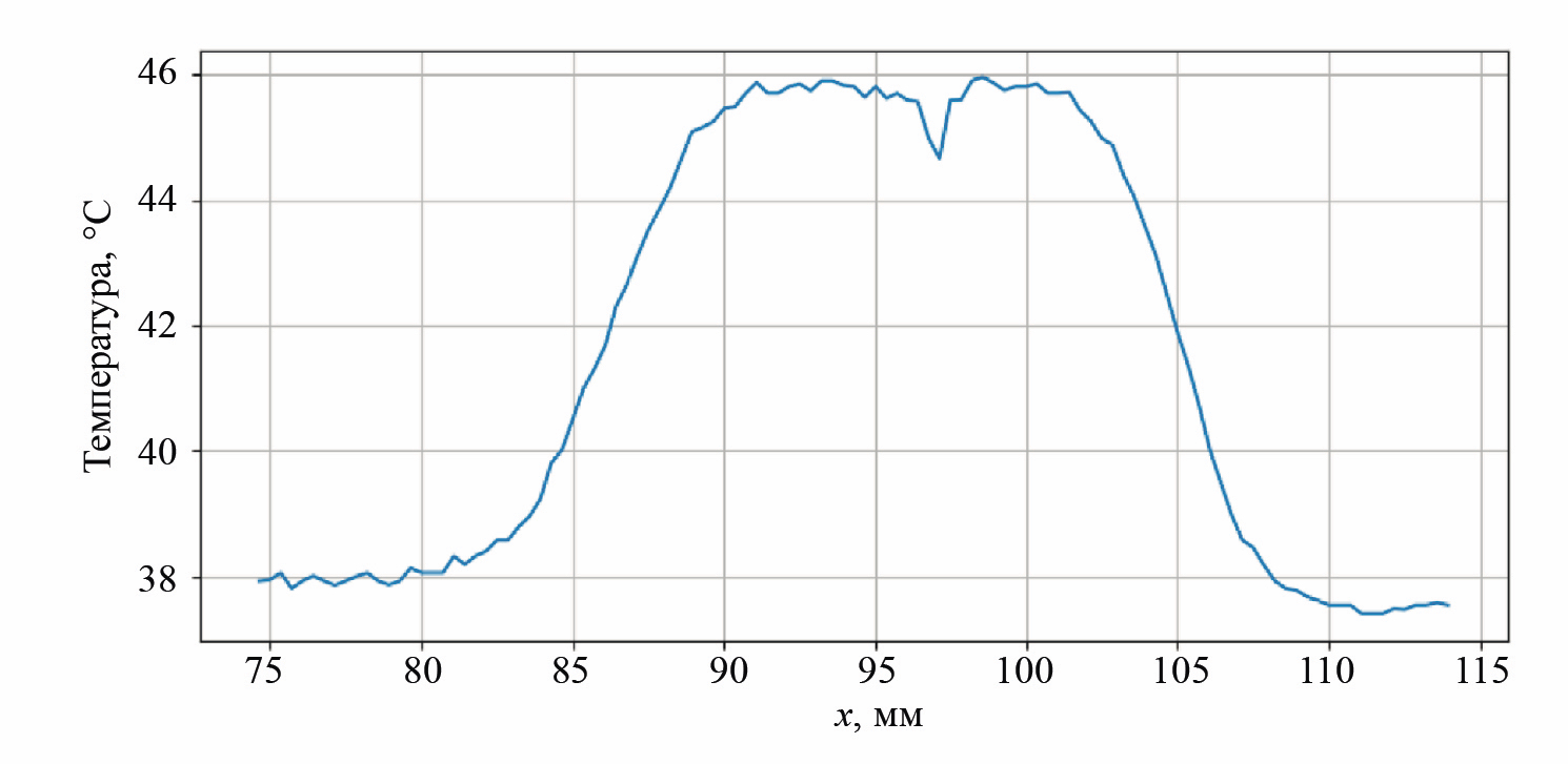 - из массива термограмм для каждого значения координаты x траектории движения пятна нагрева выбирали значения температуры, соответствующие τmax после начала нагрева. В результате чего получали термограмму в момент максимального температурного контраста (см. рис. 6);