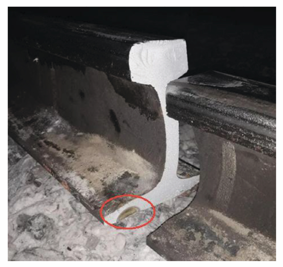 Рис. 1. Пример излома рельса из-за поперечной трещины, развивающейся в пере подошвы.