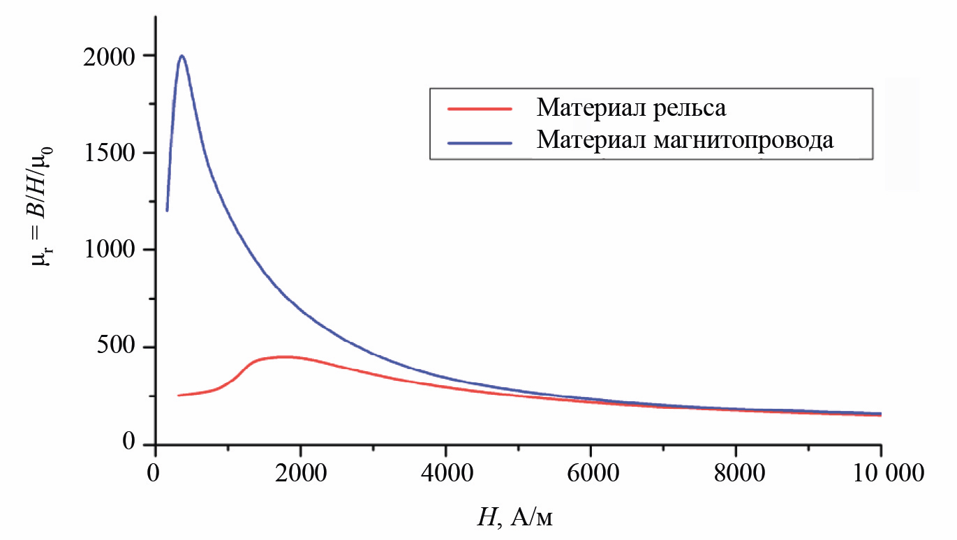 Рис. 2. Относительная магнитная проницаемость материалов магнитопровода и рельса в зависимости от напряженности магнитного поля, используемые при моделировании.