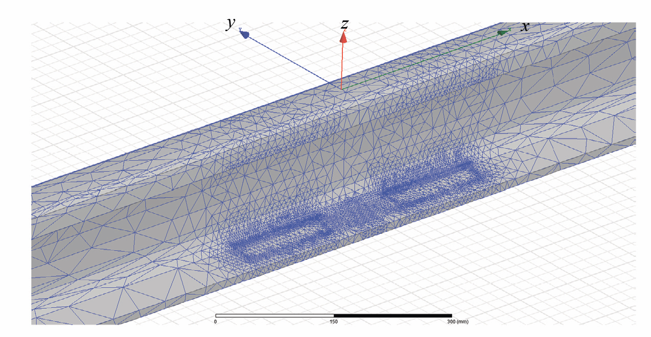 Для предварительной оценки возможности обнаружения поперечных трещин в перьях подошвы рельса магнитным методом проведены исследования посредством трехмерного моделирования процесса рассеяния магнитного потока на моделях трещин в перьях подошвы. Для расчетов использовалось специализированное программное обеспечение, реализующее метод конечных элементов применительно к системе уравнений Максвелла относительно векторов индукции и напряженности магнитного поля. Поскольку скорость перемещения намагничивающей системы и датчиков относительно рельса при контроле предполагалась относительно небольшой (до 200 мм/с), зависимость от времени искомых величин не рассматривалась, т.е. речь шла о чисто магнитостатической задаче. Это существенно сокращает объем необходимых вычислений по сравнению со случаем, когда подобных допущений не делается [21], однако не позволяет учесть ряд магнитодинамических эффектов, таких как влияние вихревых токов на распределение магнитного поля в объекте контроля и, следовательно, на сигналы датчиков. Последующие экспериментальные исследования показали допустимость таких упрощений, поскольку изменение скоростей в диапазоне до 200 мм/с приводило лишь к малозначимым низкочастотным флуктуациям сигналов, не затрагивающим амплитуду импульсов от дефектов относительно базового уровня магнитного поля.