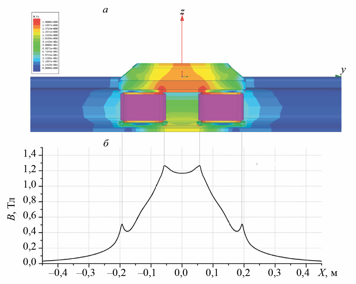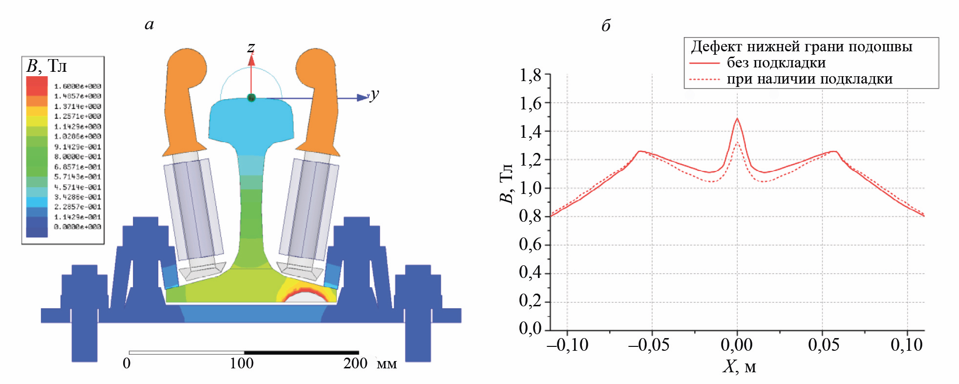 Рис. 4. Распределение магнитной индукции на поверхности рельса и на поверхностях двусторонней намагничивающей системы с сонаправленными магнитами (а); в поперечном сечении рельса и магнитопровода посередине между полюсами при наличии модели дефекта (б).
