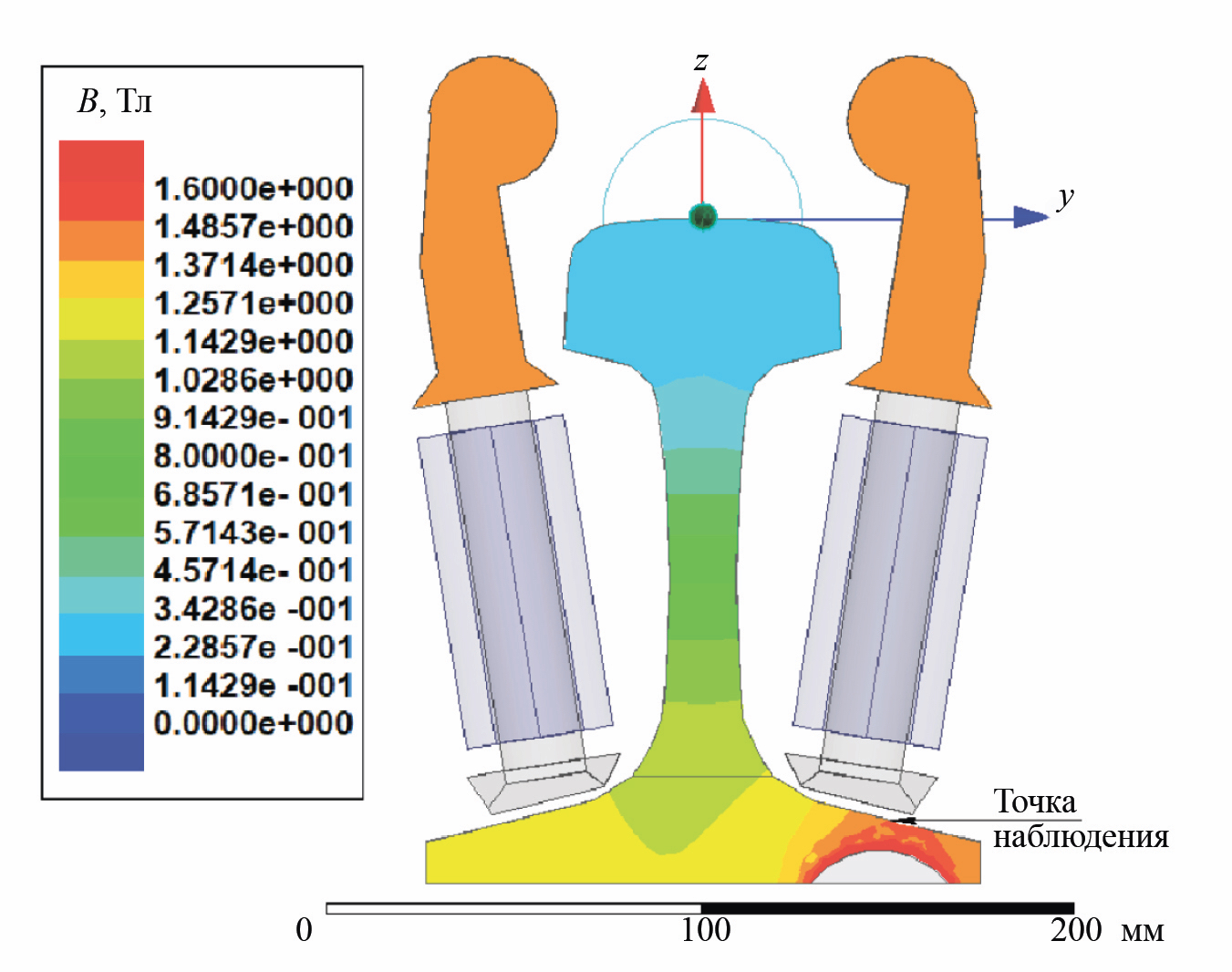 Как видно из рис. 5, наибольший уровень магнитной индукции 1,25 Тл приходится на подошву рельса под полюсами электромагнита, в то время как в середине межполюсного пространства уровень магнитной индукции составляет приблизительно 1,2 Тл.