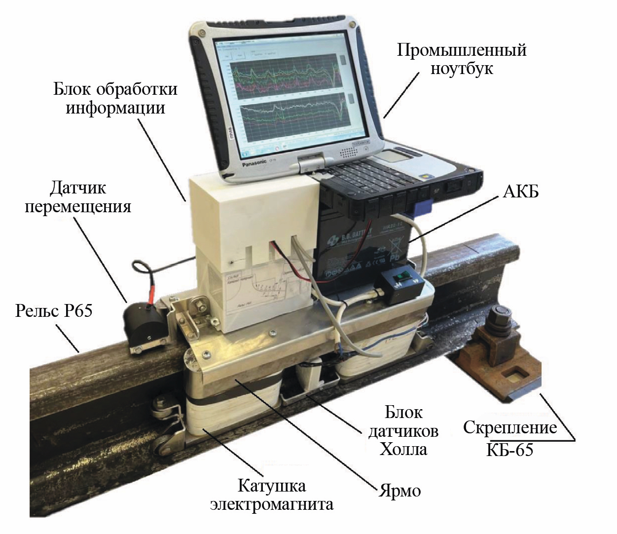 Возможность использования постоянных магнитов для намагничивающей системы следует признать неперспективной ввиду непростой конструкции системы размыкания магнитной цепи и сложности реализации процедуры оперативного съема магнитов с поверхности рельса. Использование электромагнита требует достаточно мощного источника тока (до 20 А), но все же позволяет решить проблемы снятия магнитного поля при съеме системы с рельса.