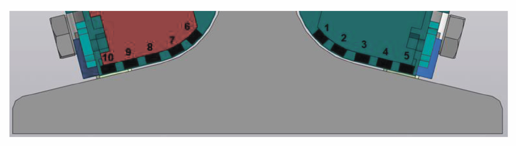 Рис. 10. Размещение датчиков Холла по поверхности перьев подошвы.
