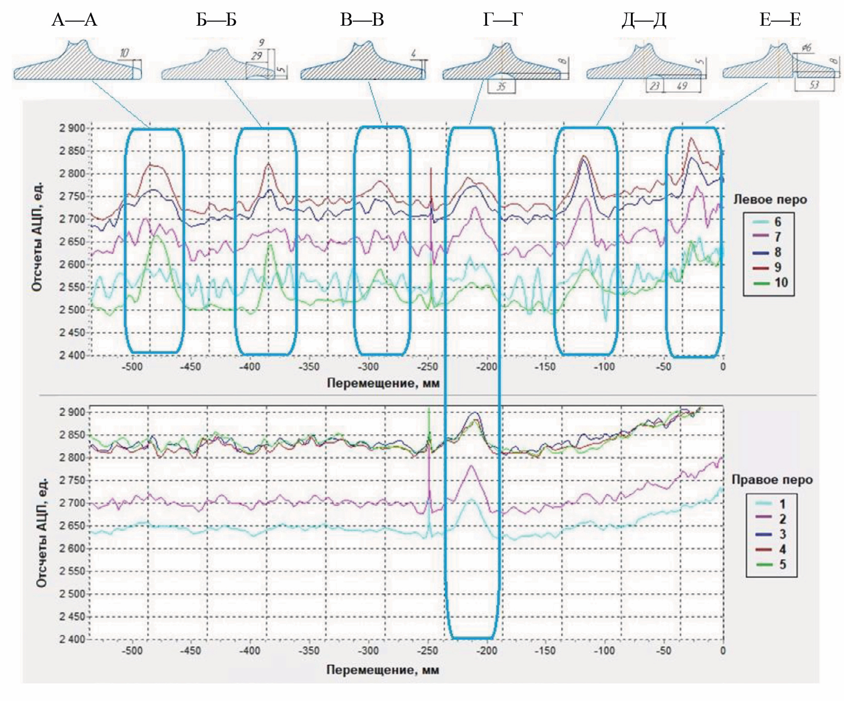 Все изготовленные модели трещин выявлены вне зоны рельсовых скреплений. Как и ожидалось, наличие рельсовых скреплений (см. рис. 8) приводит к снижению уровня намагниченности металла рельса и, как следствие, к уменьшению амплитуды полезного сигнала от модели дефектов. Модели дефектов В—В (пропил глубиной всего 4 мм на краю пера), Г—Г (пропил в центральной части рельса в проекции шейки), Е—Е (вертикальное сверление — неплоскостной дефект) хоть и дают соответствующие отклики, однако амплитуда таких сигналов сопоставима с уровнем шумов.