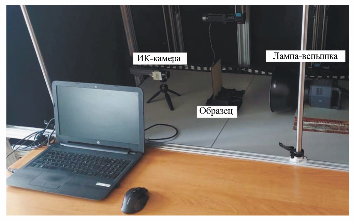 Лабораторная установка импульсного оптического ТК включала ИК-тепловизор Optris PI450 (спектральный диапазон 8—14 мкм, формат кадра 382×288, частота записи кадров до 30 Гц в диапазоне температур от 0 до 250 °С), импульсные ксеноновые лампы (энергия излучения 1,6 кДж, длительность около 10 мс), блок синхронизации, а также персональный компьютер с программным обеспечением (ПО) для обработки данных ThermoLab. Фотография лабораторной установки ТК приведена на рис. 3.
