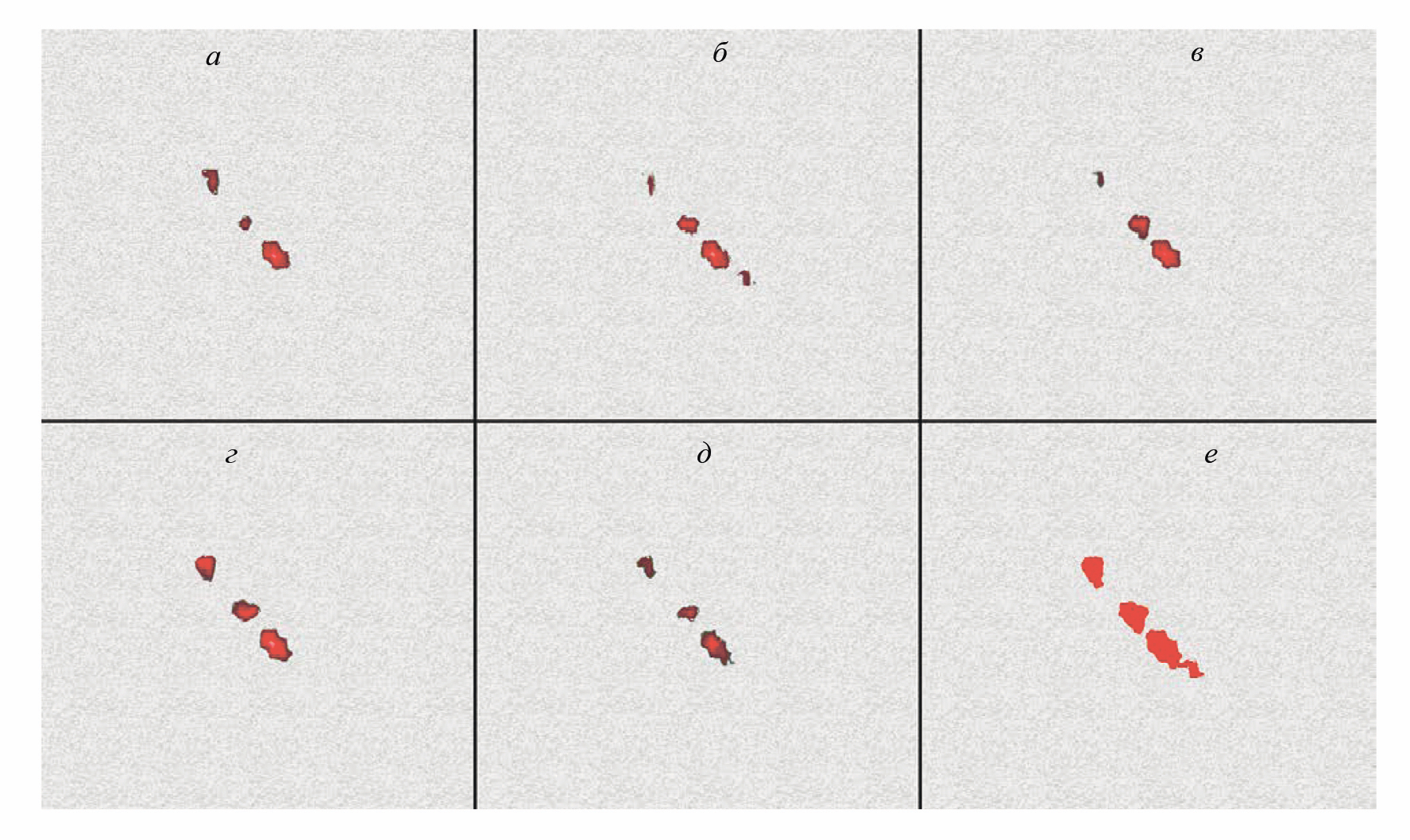 На рис. 7 приведены результаты оценки дефектных областей в образце в диапазоне частот от 21,25 до 21,531 кГц и их дизъюнктивного синтеза. Для уточнения границ дефектной области было применено булево сложение (дизъюнкция) результатов эксперимента (см. рис. 7е). Указанная процедура позволила ограничить максимальную зону дефекта для каждого рассматриваемого изображения. Результаты приведены в табл. 1.