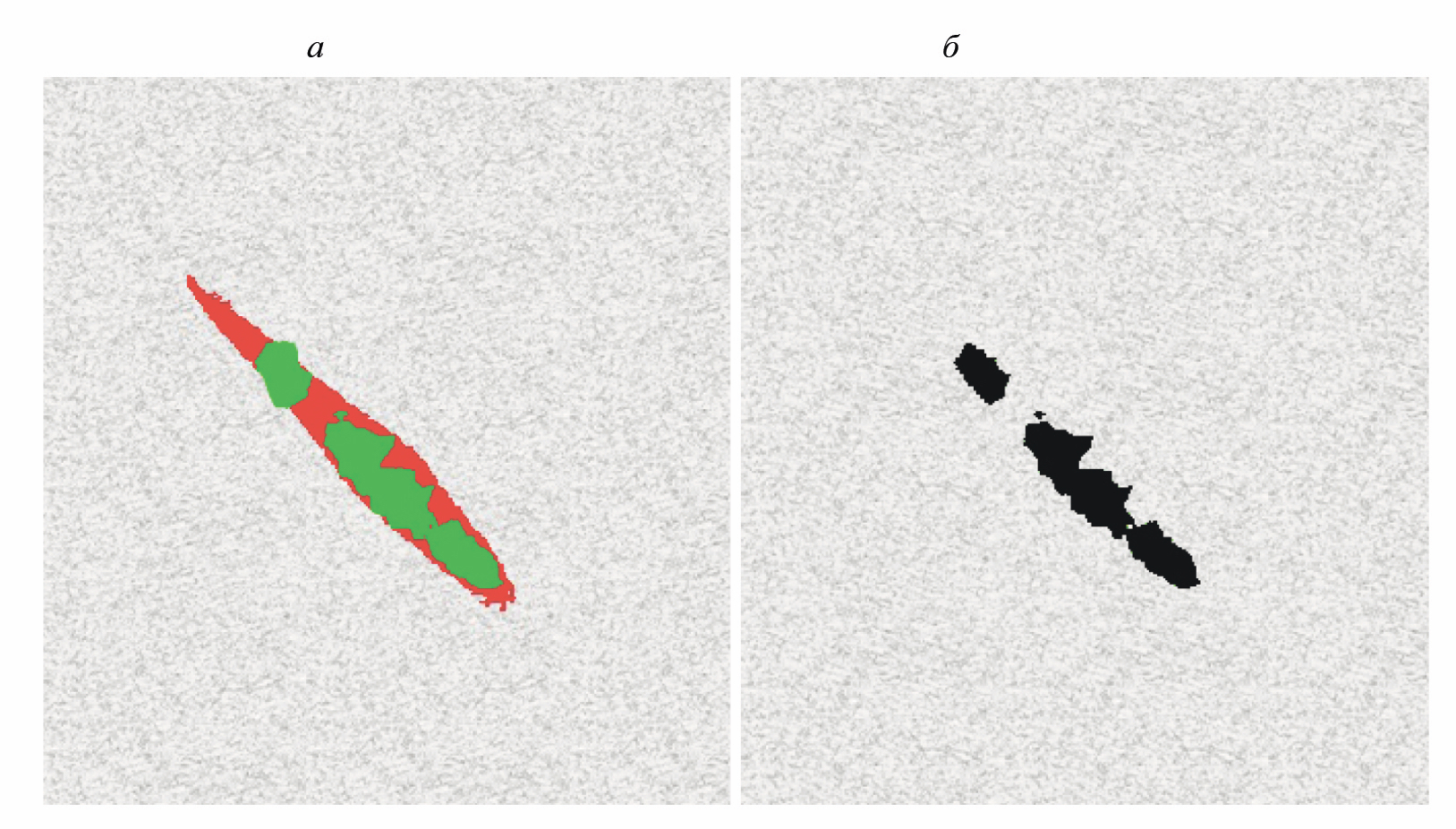 Синтез результатов ЛВ и ТК был проведен в ПО DeFinder двумя способами: путем булевого сложения и булевого умножения графических изображений. Алгоритм дизъюнктивного и конъюнктивного синтеза данных позволяет получить изображение, основанное на соответствующих логических операциях, примененных к пикселям с одинаковыми координатами на двух изображениях. Результатом этих операций являются области объединения и пересечения дефектных зон соответственно. На рис. 10 приведены результаты дизъюнктивного (а) и конъюнктивного (б) синтеза данных ЛВ и ТК.