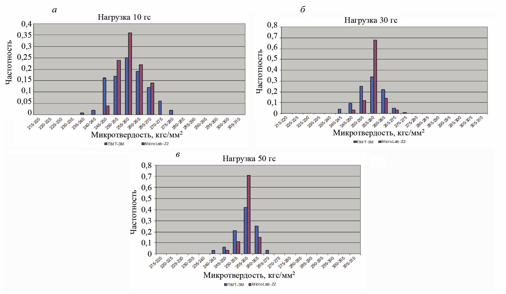 Измерения значений микротвердости выполнялись при нагрузке в 50 гс на стационарном микротвердомере ПМТ-3М в соответствии с ГОСТ 9450—75 [13]. В обоих случаях наносилось по 30 отпечатков.