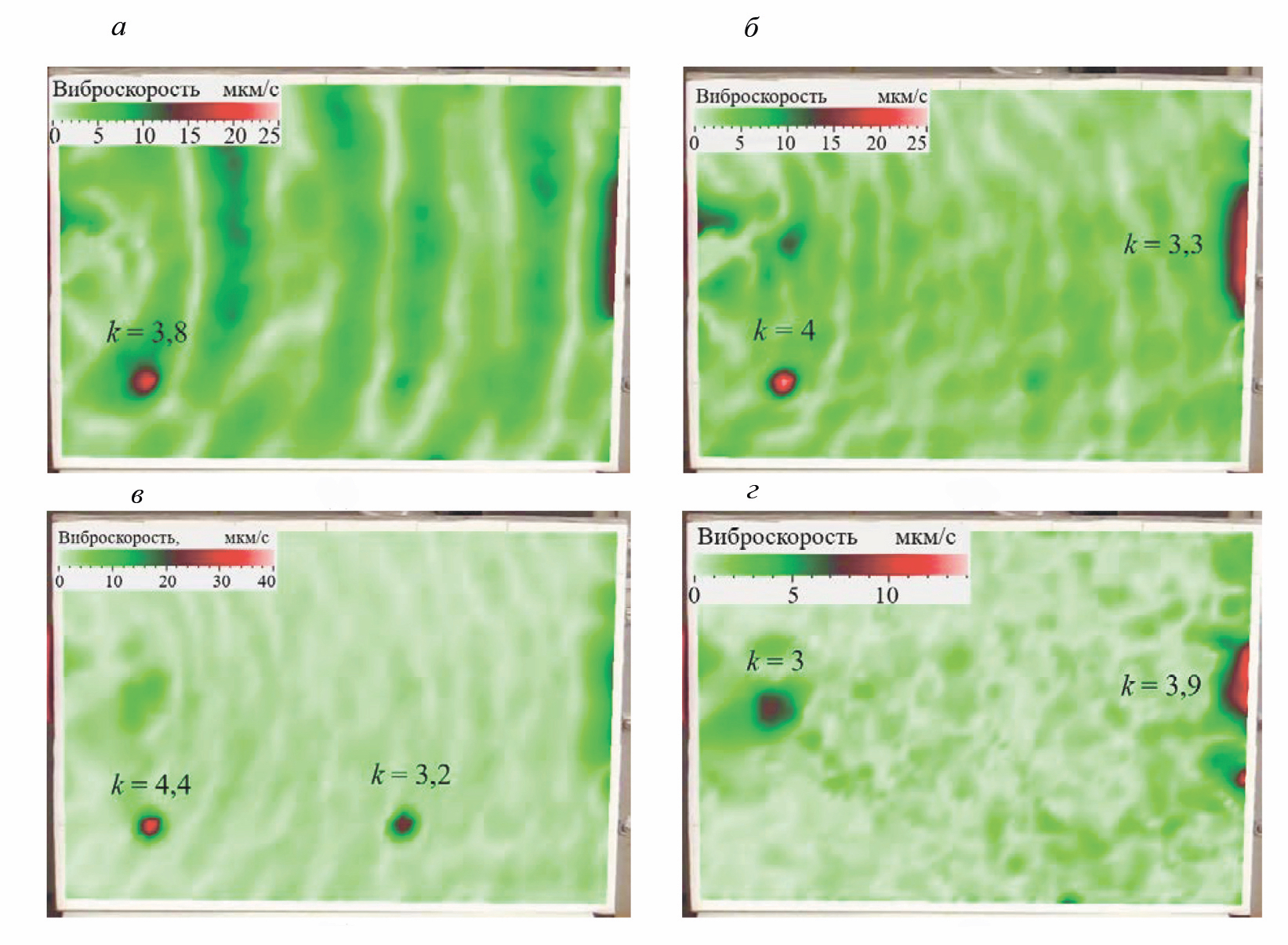 Рис. 10. Виброграммы стеклопластикового композита на частотах 7,33 кГц (а); 10,3 кГц (б); 12,8 кГц (в); 35,9 кГц (г)