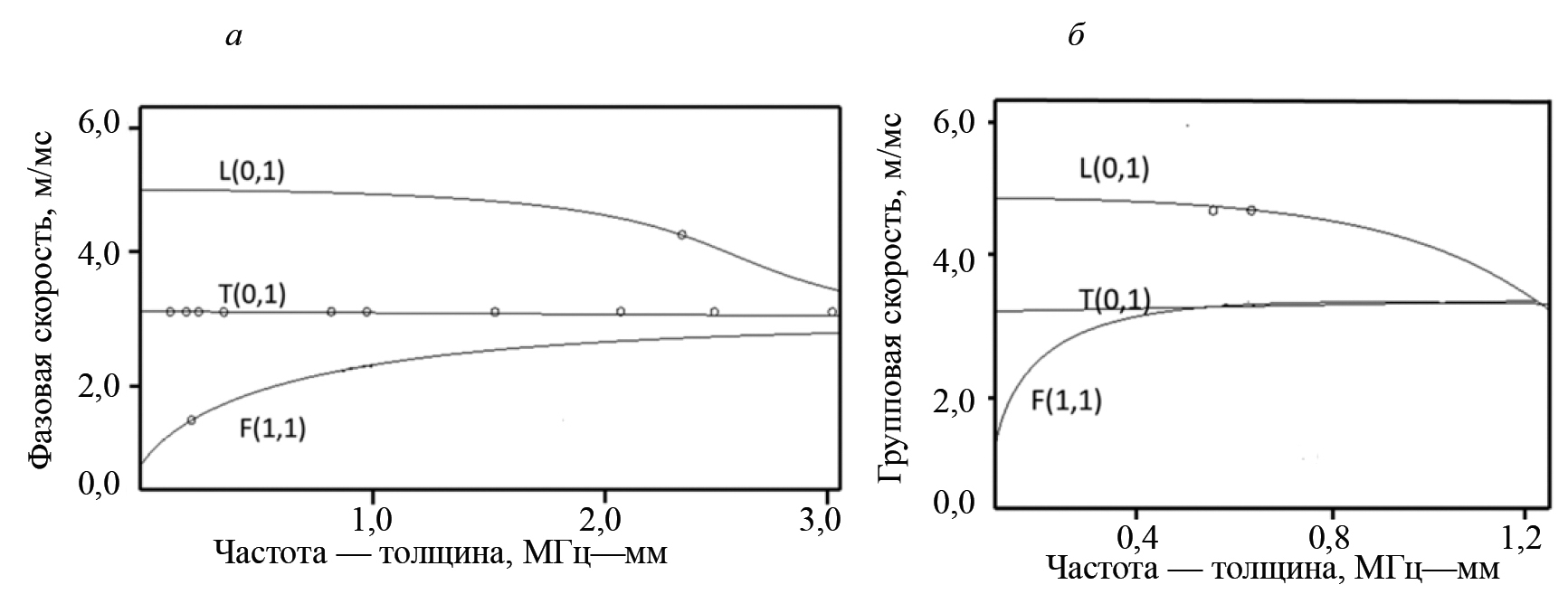 Рис. 1. Дисперсионное соотношение для нержавеющей стали: фазовая скорость (а); групповая скорость (б)