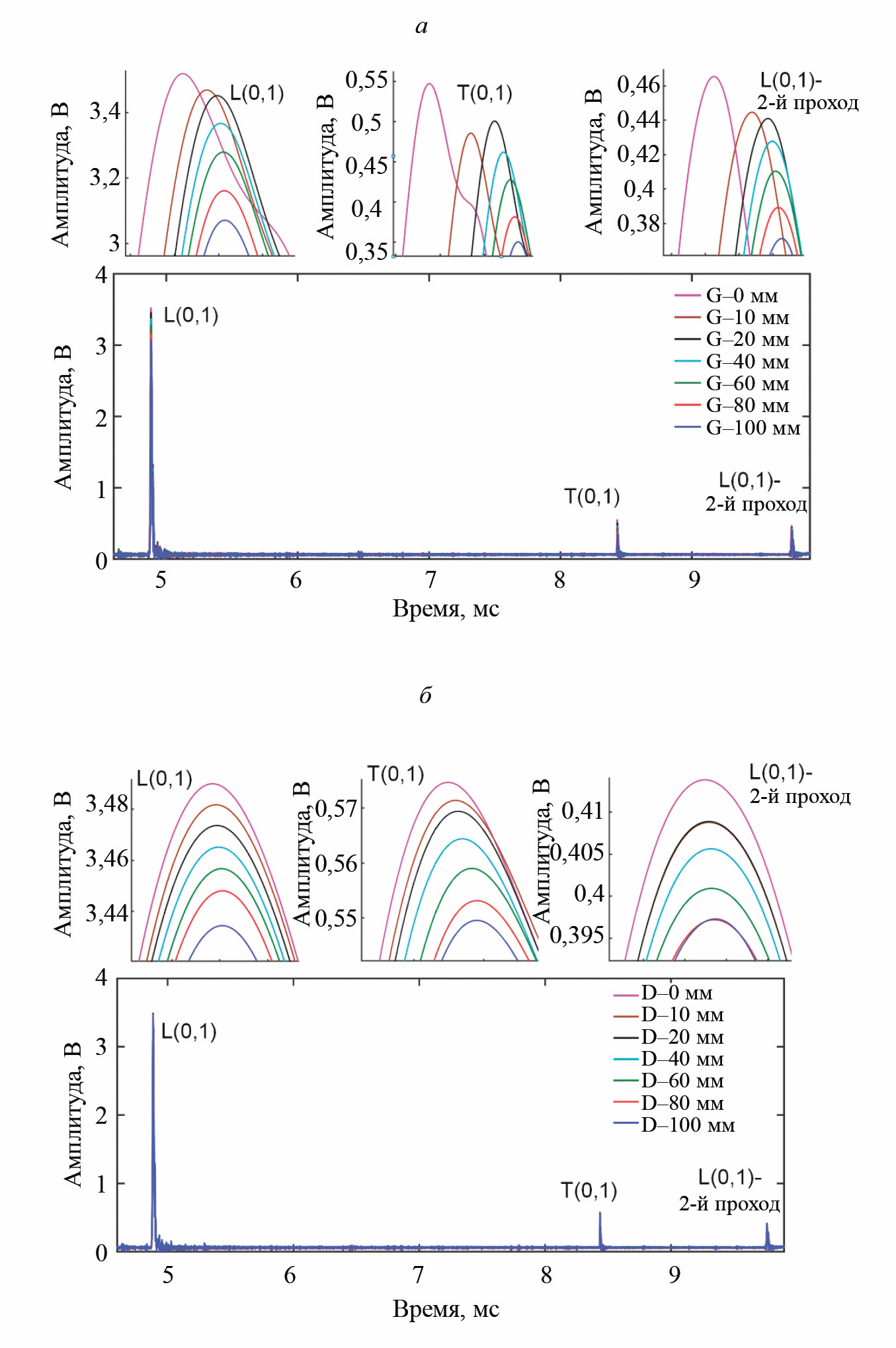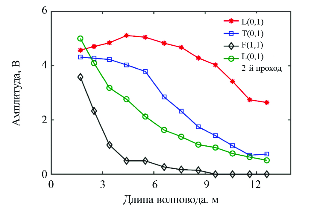 При разработке длинного датчика был исследован эффект затухания в длинном волноводе из нержавеющей стали путем проведения экспериментов с использованием всех трех мод волны. В этом эксперименте было определено затухание распространения волн для трех режимов, а именно F(1, 1), T(0, 1) и L(0, 1). Для проведения исследования затухания мы рассматривали волновод начальной длины 12,6 м. Полученный сигнал А-скана включал моды L(0, 1) и T(0, 1) на длине 12,6 м, как показано на рис. 10а. После этого длинный волновод отрезали через каждые 1 м, чтобы определить эффект затухания при уменьшении длины волновода от 12,6 м. Во время этого эксперимента датчик сдвига надежно и плотно подсоединили с ориентацией 45 град [20, 35] и приложили соответствующее давление, чтобы получить все три волновые моды. Длина волновода была уменьшена (путем отрезания) с 12,6 до 1,72 м. Волновые моды F(1, 1), T(0, 1) и L(0, 1) совместно наблюдались (см. рис. 10б—г) на определенных длинах волновода (от 6,6 до 1,72 м). Амплитуды сигналов волновых мод L(0, 1) и T(0, 1) увеличивались при одновременном уменьшении длины волновода с 12,6 до 1,72 м.