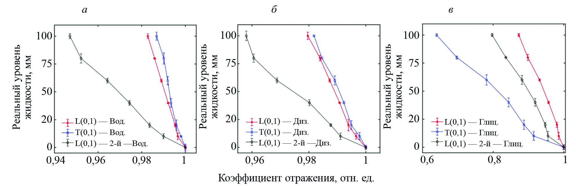 На основании полученных результатов (см. рис. 8) были составлены эмпирические уравнения, основанные на фактическом уровне заполненной жидкости (объемным методом с помощью шприца объемом 20 мл) и соответствующем коэффициенте отражения L- и T-волновых мод датчика. Коэффициенты эмпирических уравнений и коэффициент корреляции (R2) приведены в табл. 3, x и y представляют собой коэффициент отражения (КО) и уровень жидкости в мм соответственно.