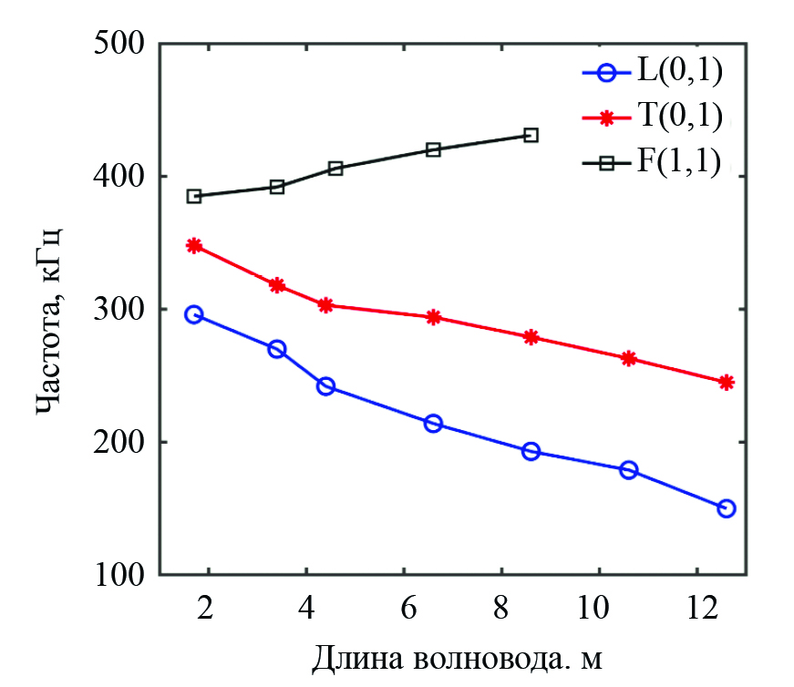 Таблица 4. Скорости волн мод L(0, 1), T(0, 1) и F(1, 1) при различных длинах L волновода, м/с