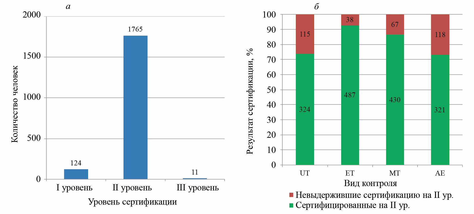 Рис. 1. Результаты присвоения уровней сертификации (а) и II уровня сертификация по различным видам неразрушающего контроля (б)