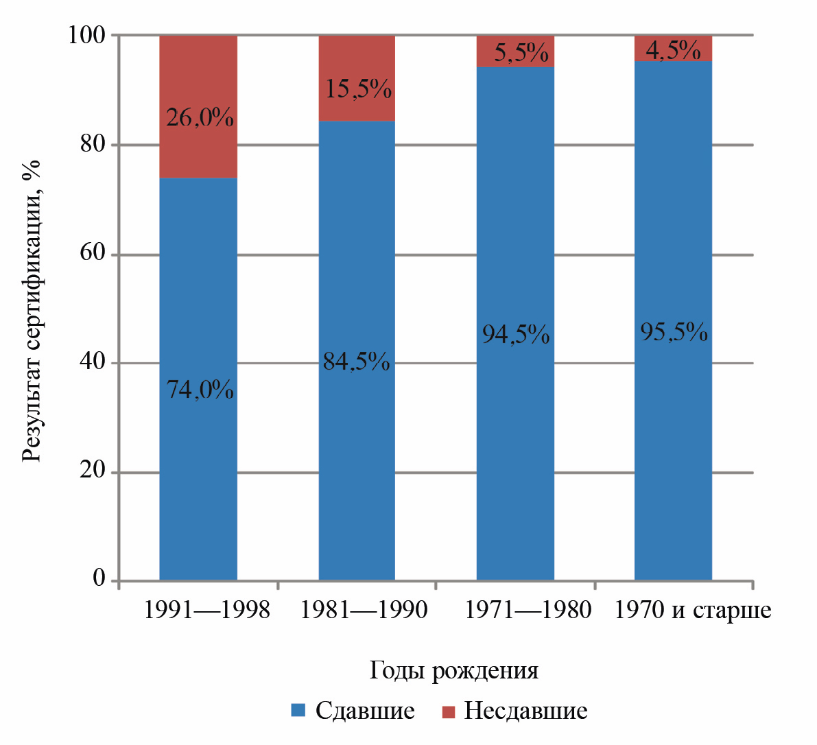 Средний процент сдачи квалификационных экзаменов повышается с возрастом кандидатов (рис. 5): для кандидатов 1971 г. рождения и старше он составляет 95 %, для кандидатов 1981— 1990 гг. рождения — 85 %, что также является хорошим результатом, для кандидатов 1991— 1998 гг. рождения — 74 %, что всего лишь на 4 % выше порогового значения, при котором экзамен считается сданным. Данные показатели также обусловлены стажем работы кандидатов и накопленными знаниями, умениями и навыками в процессе производственной деятельности, а также предыдущих процедур сертификаций по НК.
