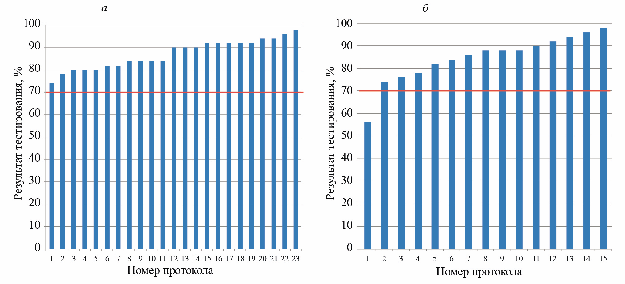 На рис. 6 представлены гистограммы результатов тестирования группы испытуемых по общему экзамену вихретокового контроля, проведенного в 2021 (а) и в 2022 гг. (б). Данные ранжированы по возрастанию результата кандидата с условным номером протокола (первый условный номер протокола присвоен специалисту с минимальным результатом тестирования). Согласно рис. 6а, в 2021 г. все 23 кандидата были допущены, из них 12 кандидатов (52 %) имели результат тестирования не ниже 90 %. Согласно рис. 6б, в 2022 г. из 15 тестируемых кандидатов 5 человек (30 %) имели результат тестирования не ниже 90 % и 1 кандидат не справился с тестом.