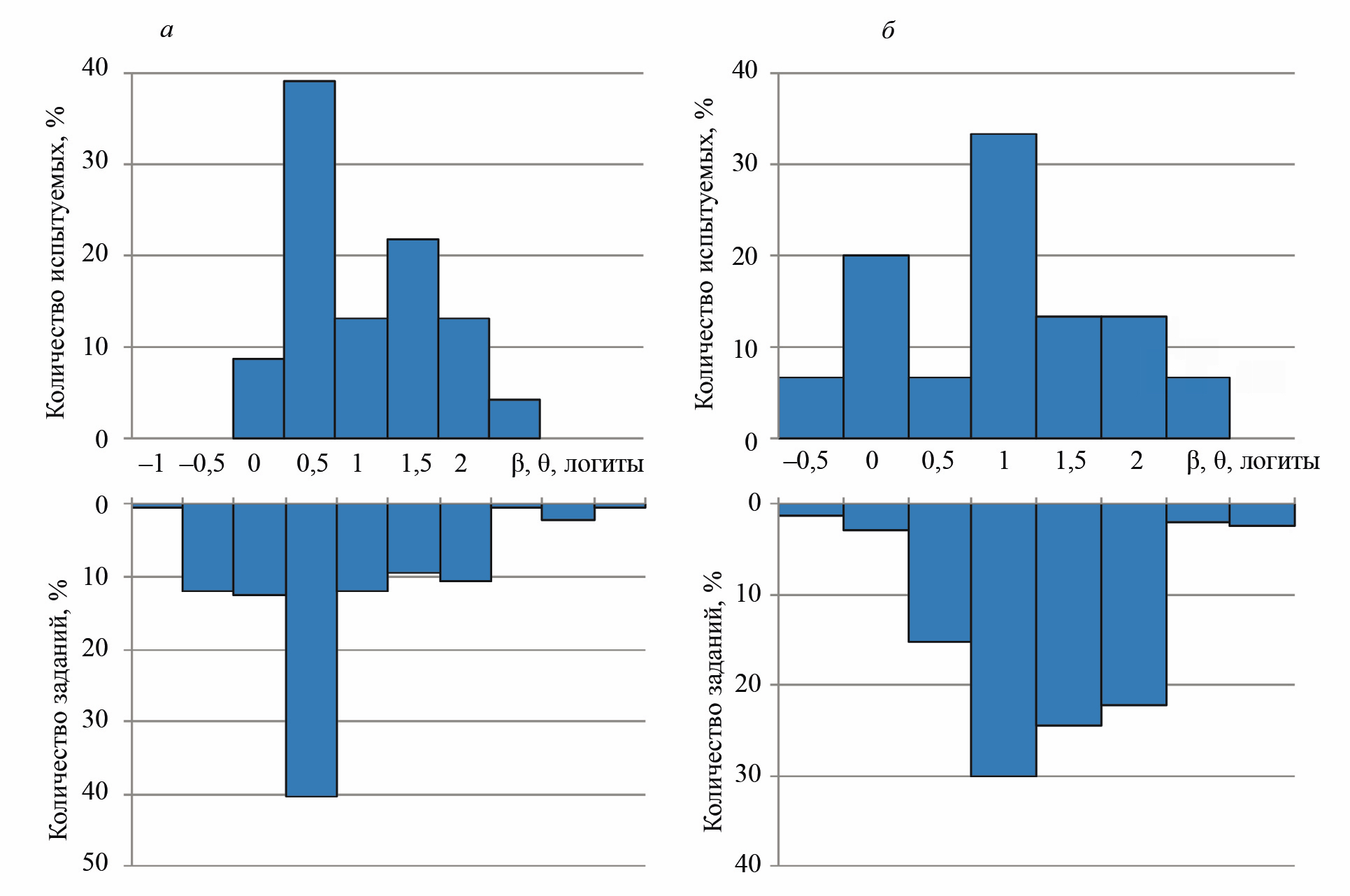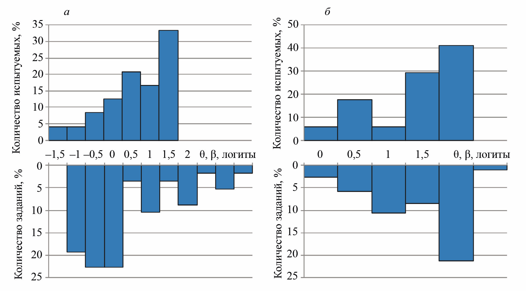 Гистограммы распределения значений латентных параметров уровня подготовленности кандидатов и трудности заданий в логитах представлены на рис. 8. Отрицательным значениям логитов трудности заданий и обученности кандидатов соответствуют наиболее легкие задания и низкий уровень подготовки кандидатов. Напротив, положительным значениям логитов — наиболее сложные задания и хорошо подготовленные кандидаты. Известно, что средняя трудность заданий не должна отличаться от среднего уровня подготовленности более чем на 0,5 логита [6, 7]. В противном случае оценка уровня знаний кандидатов будет производиться с различной точностью в зависимости от диапазона трудностей заданий.