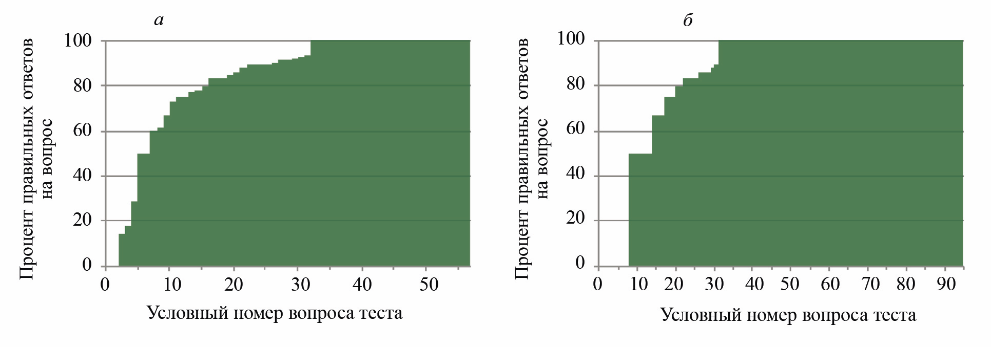 Рис. 7. Распределение правильных ответов по отдельным вопросам теста общего экзамена в 2021 (а) и 2022 (б) гг.
