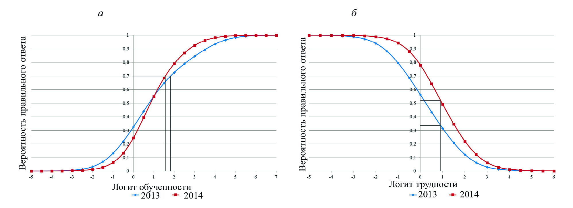 В частности, если разность между уровнем подготовленности участника тестирования и трудностью тестового задания составляет 1 логит, то вероятность верного выполнения этим испытуемым такого задания равна 73 %.