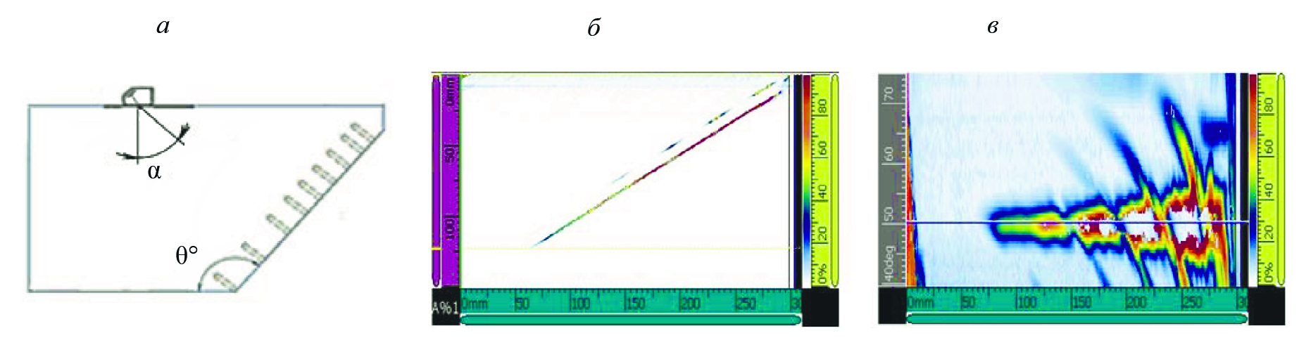 Также отметим, что, как показано в [38, 45], амплитуда сигнала от сверления в широком диапазоне углов и свойств материалов пропорциональна углу наклона оси цилиндра. Это дает возможность снизить влияние наклонов оси сверления на результаты настройки параметров УЗ контроля.
