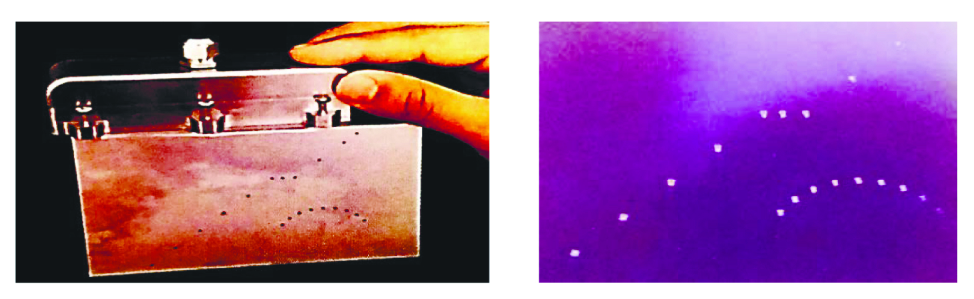 На рис. 20 иллюстрируется акустическое изображение БЦО диаметром от 1 мм, полученное методом FMC/TFM. Координаты сверлений можно определить в пределах 1 мм. Аналогичные изображения объемных дефектов можно найти в [8, 59] и других источниках. Но возникает вопрос: как выглядят акустические изображения плоскостных дефектов? Возможный ответ приведен, например, в [62]. Используя специальные алгоритмы обработки на основе метода ЦФА, авторы получили акустические изображения щели, раскрытием менее 1 мм, глубиной 4 мм в образце толщиной 17 мм из стали Ст20 в сравнении с изображением БЦО диаметром 1,5 мм — рис. 21.