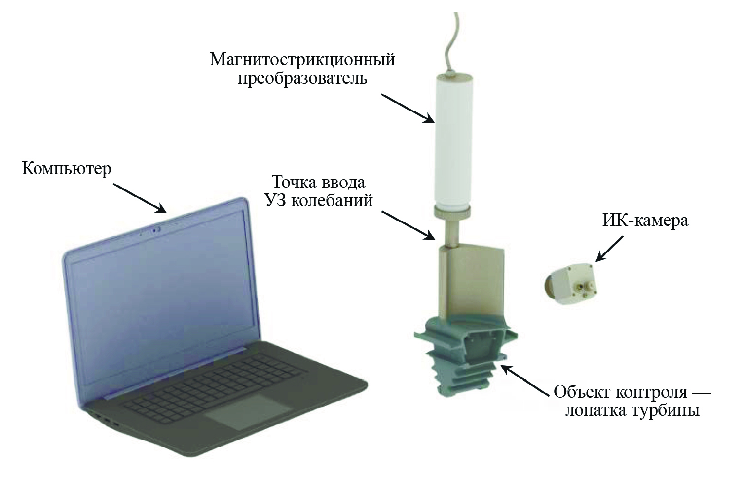 Типичная экспериментальная установка для термоакустического контроля (см. схему установки на рис. 2) состоит из УЗ преобразователя, который для ввода механических колебаний прижимают к объекту контроля, ИК-камеры, с помощью которой регистрируют температурное поле объекта контроля, и компьютера, на который передают данные для их дальнейшей обработки и анализа качества изделия на наличие дефектов.