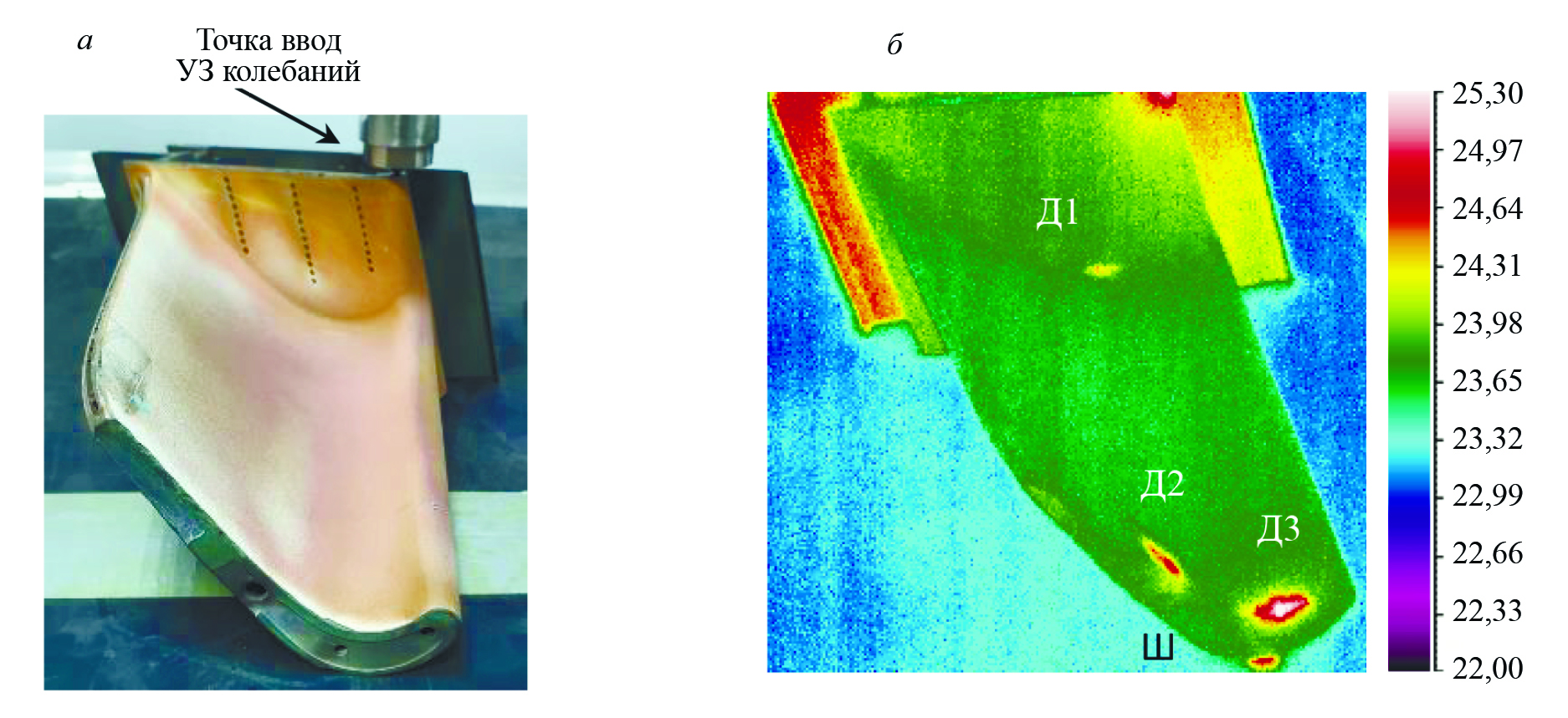 На рис. 3 приведены фотография процесса УЗ стимуляции лопатки и соответствующая термограмма. Стимуляцию проводили в течение 10 с при частоте записи термограмм 10 Гц. В результате были выявлены три зоны повышения температуры, которые обозначены Д1, Д2, Д3 и могут быть интерпретированы как дефекты керамического покрытия.