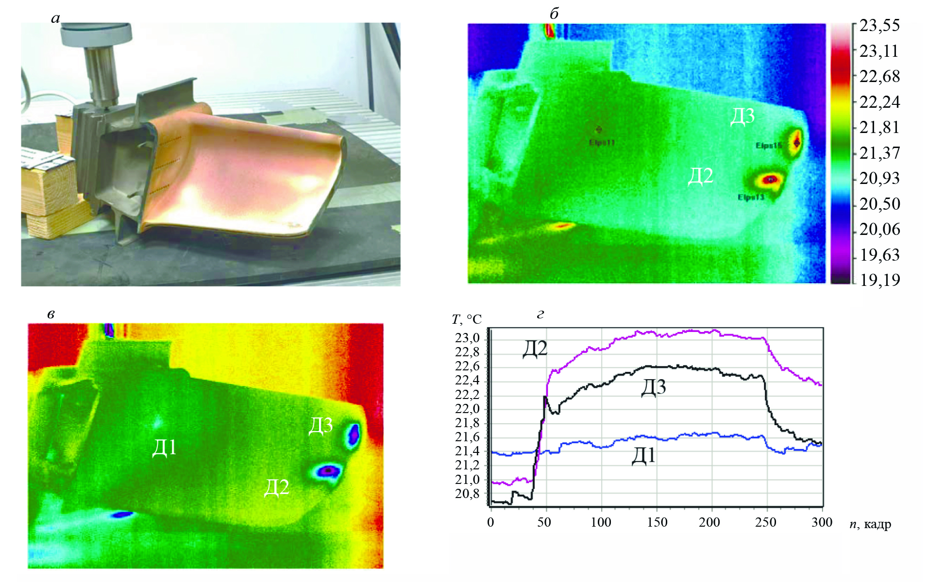Результаты экспериментов, которые были проведены при контроле лопатки турбины со стороны А при вводе УЗ стимуляции в точку № 2 (длительность стимуляции 20 с), находящуюся в зоне замка лопатки, приведены на рис. 5. На исходной термограмме (см. рис. 5б) отчетливо видны две дефектные зоны Д2 и Д3 на торце пера лопатки. Обработка последовательности термограмм методом анализа главных компонент (АГК) позволила выявить плохо распознаваемую дефектную отметку Д1 (см. рис. 5в). На рис. 5г показаны графики изменения температуры в зонах Д1—Д3 для исходной последовательности термограмм. Видно, что в процессе УЗ стимуляции температура в области Д1 практически не изменяется, в то время как в областях Д2 и Д3 температура возрастает на 1-2 °С.