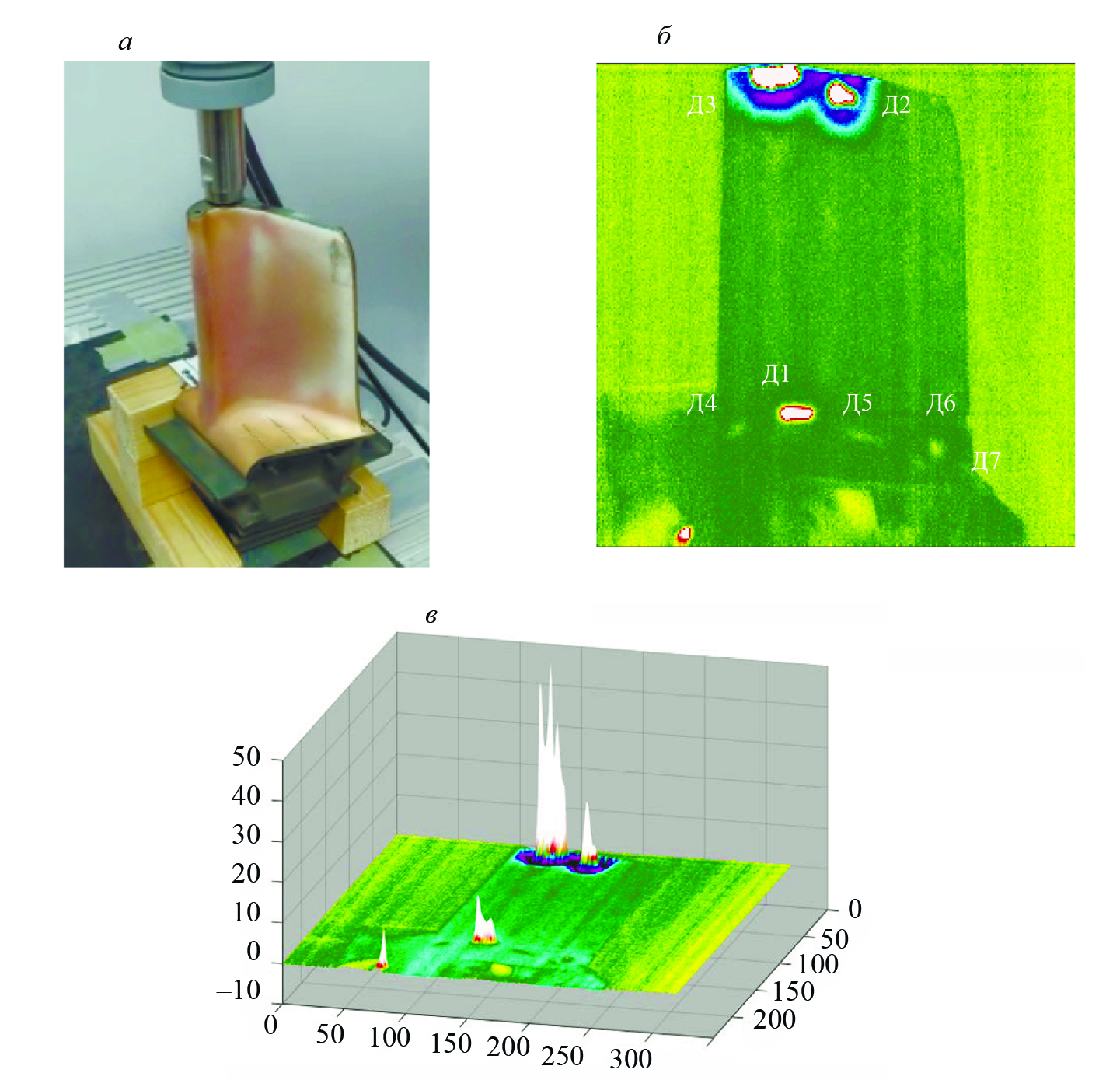 При вводе УЗ колебаний в торец пера лопатки (точка № 3) при контроле стороны А были обнаружены дефекты Д4—Д7, расположенные в зоне примыкания пера лопатки к полке (см. результаты на рис. 6). Наличие данных дефектов было подтверждено с помощью капиллярного НК (результаты схематично отмечены на рис. 7). Для большей наглядности уровня температурных сигналов в зонах дефектов Д1—Д3 по сравнению с температурными сигналами дефектов Д4—Д7, находящихся в зоне перехода пера лопатки в полку, на рис. 6в приведена термограмма в трехмерном представлении.