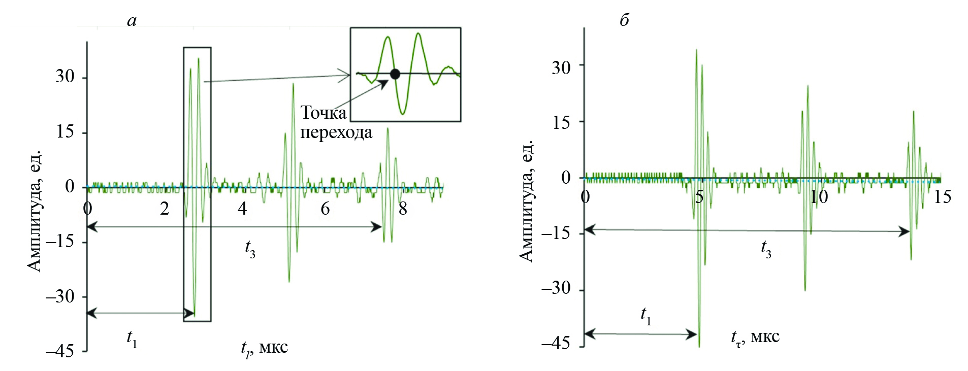 Полученные амплитудно-временные диаграммы эхо-импульсов показаны на рис. 2а для продольной и на рис. 2б для поперечной волны. Время распространения упругих волн t = 0,5(t3 – t1) измерялось между первым t1 и третьим t3 отраженными импульсами по точкам перехода нуля между минимумом и максимумом в импульсе (см. рис. 2а).