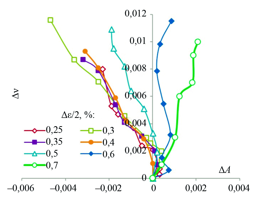 Как видно из рис. 3, интенсивность изменения параметров Δν и ΔA существенно зависит от амплитуды деформации Δε/2. Зависимость изменения коэффициента Пуассона от накопленной циклической деформации близка к линейной. Максимальное изменение коэффициента Пуассона от его начального значения составляет 4 %. Максимальное изменения параметра A от –0,0037 до –0,005 происходит при амплитуде деформации ∆ε/2 = 0,3 %.